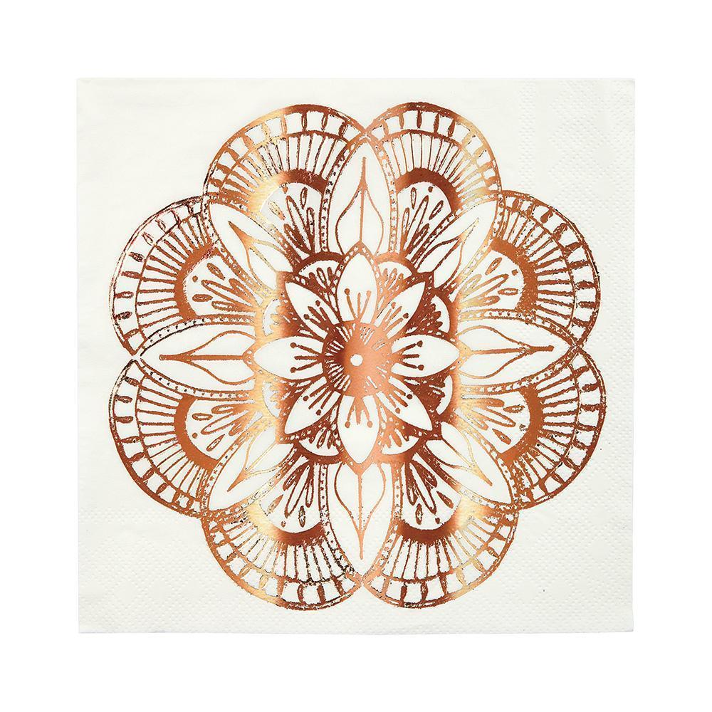 These beautiful napkins will look wonderful at your wedding party. Stylishly decorated with a traditional mandala pattern embellished with rose gold foil for a touch of elegance.