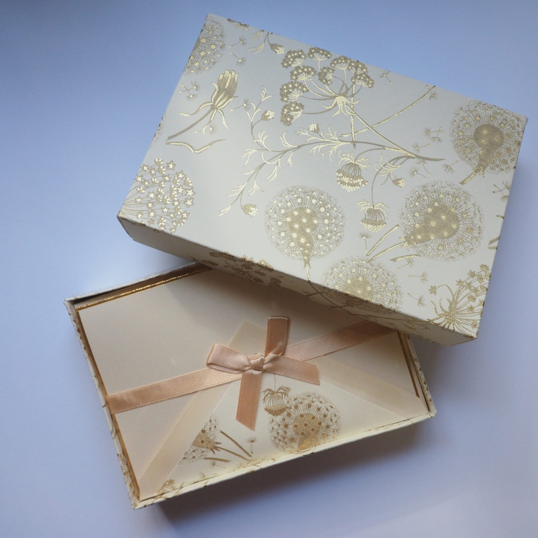 Boxed 10 gold bordered cards and 10 lined envelopes