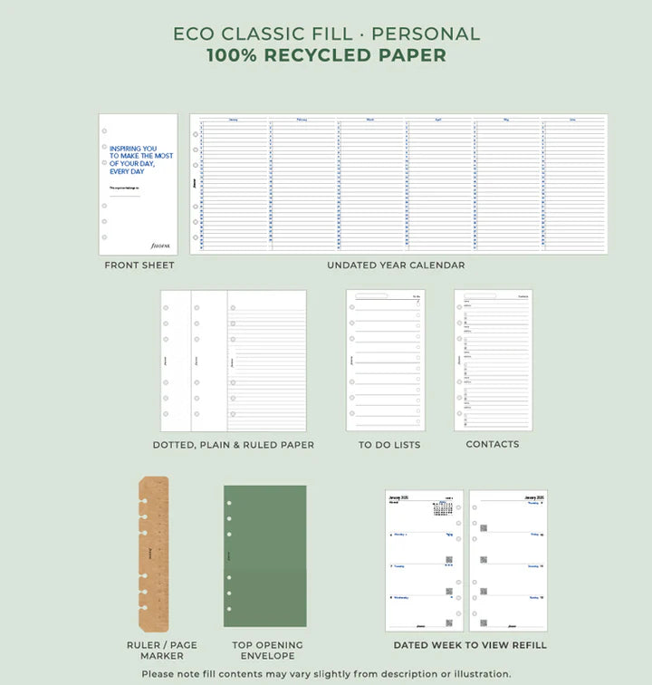 Dated Week to View Refill (English language), paper flyleaf, front sheet, undated year planner, dotted paper, plain paper, ruled paper, to do lists, contacts, eco ruler / page marker, cardstock envelope.