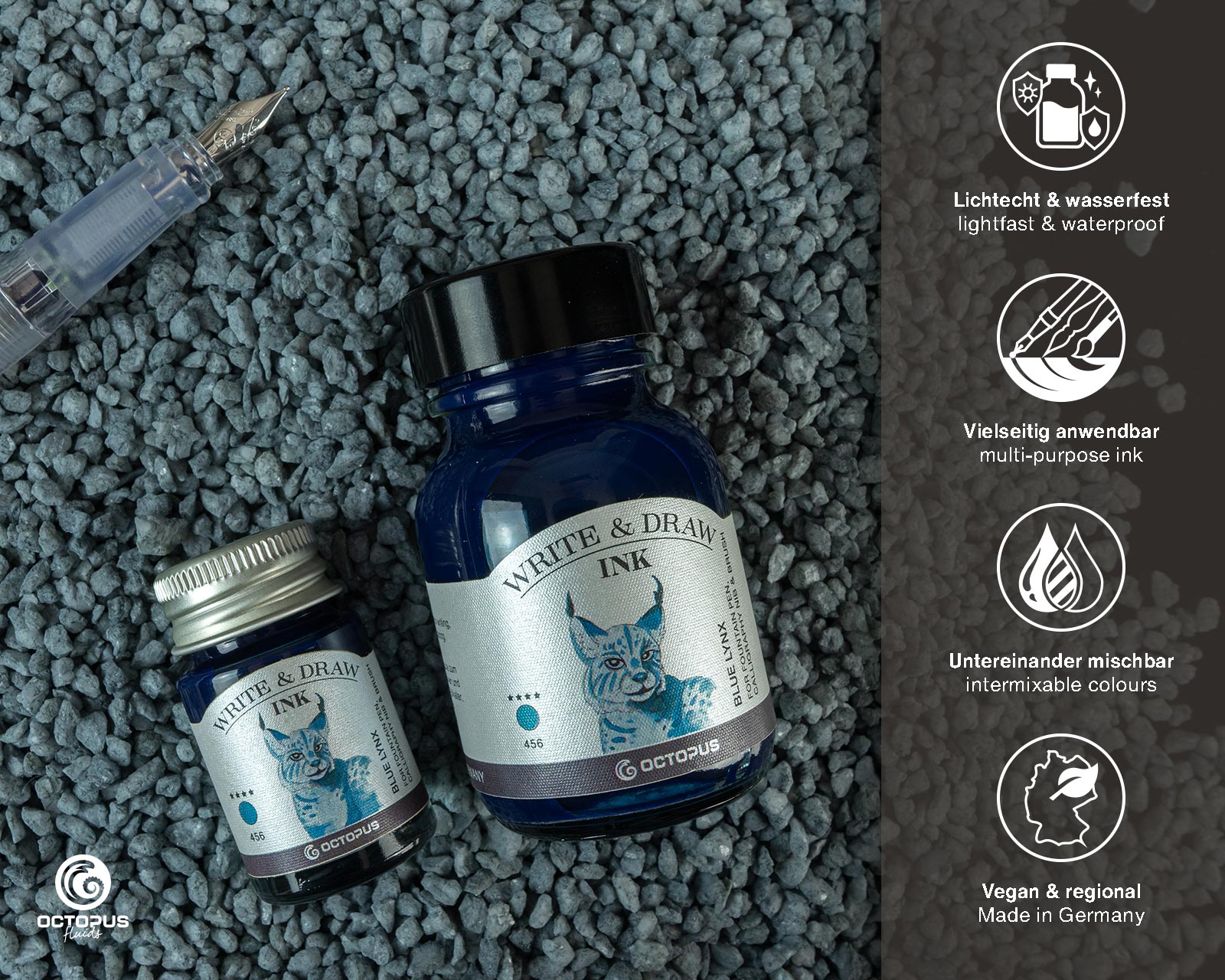 In contrast to most other waterproof inks, the Octopus Write & Draw can be used in the fountain pen without hesitation. However, care should be taken not to let the filler dry out. The water resistance of the Write & Draw Inks is created with the help of a cross-linking binder, which can no longer be easily removed when dry. We therefore recommend that you rinse and clean your writing instrument carefully after use to prevent the ink from accidentally drying out.