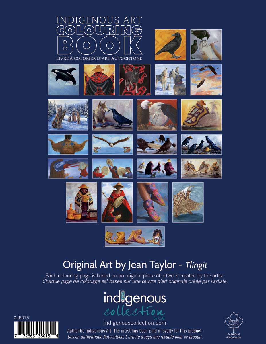Indigenous art colouring book by artist Jean Taylor. Her cultural background is Tlingit. The dimensions of the colouring book are 8.5 x 11" and it features 28 colouring pages based on original pieces of artwork created by the artist. It also contains information on the artist's cultural background, the artist's biography and photos. The back cover highlights the original art for reference. The artist or copyright holder has been paid a royalty for the sale of this product. Made in Canada.