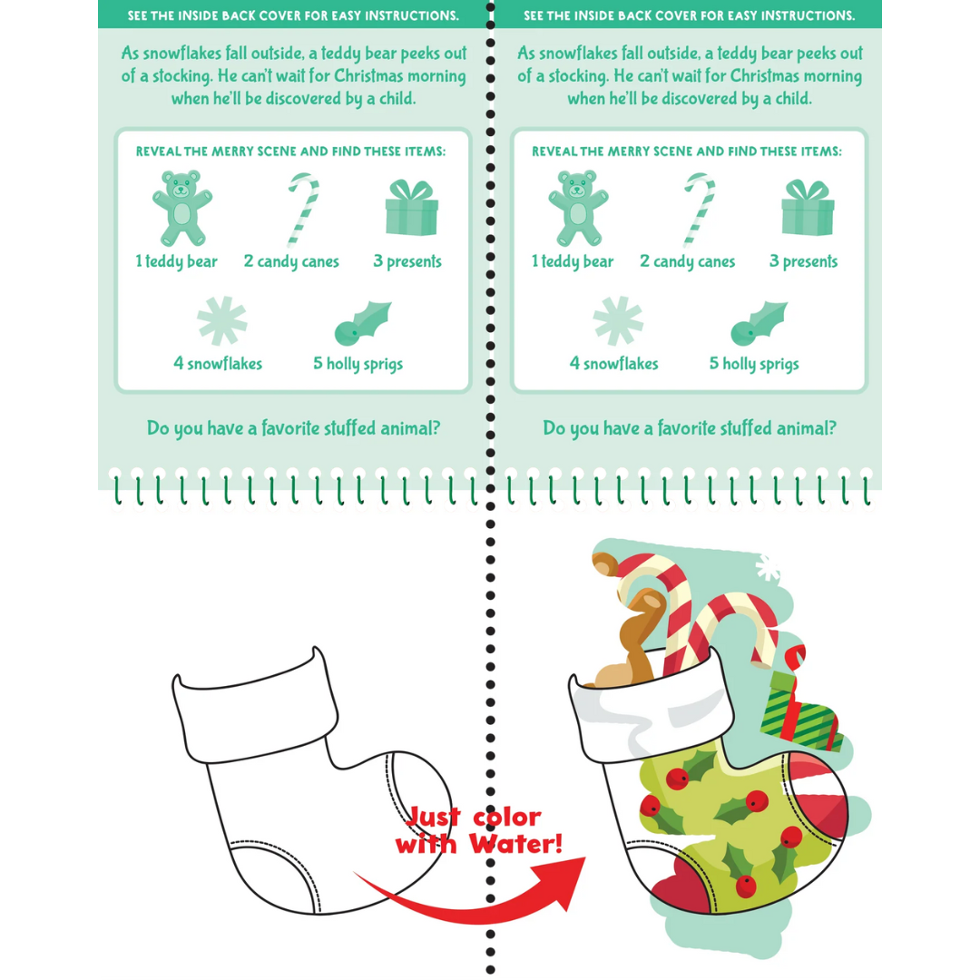 This Color with water colouring book is the perfect mess-free activity for the holiday season! Brush the scene with the water pen and see the colours and hidden objects appear.