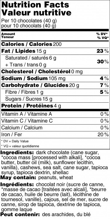 Savor the exquisite combination of Dry Roasted Sea Salt Cashews enveloped in rich dark chocolate. Crafted in Victoria, BC, Canada, these decadent treats offer a symphony of flavors, blending the buttery crunch of cashews with the velvety richness of dark chocolate. As the ultimate souvenir from Victoria, Vancouver, or Canada, indulge in the taste of unparalleled craftsmanship. Elevate your snacking experience with this perfect fusion of salty and sweet, capturing the essence of Canadian culinary excellence in every delightful bite. Take home a piece of indulgence that reflects the finest in chocolate-covered perfection.