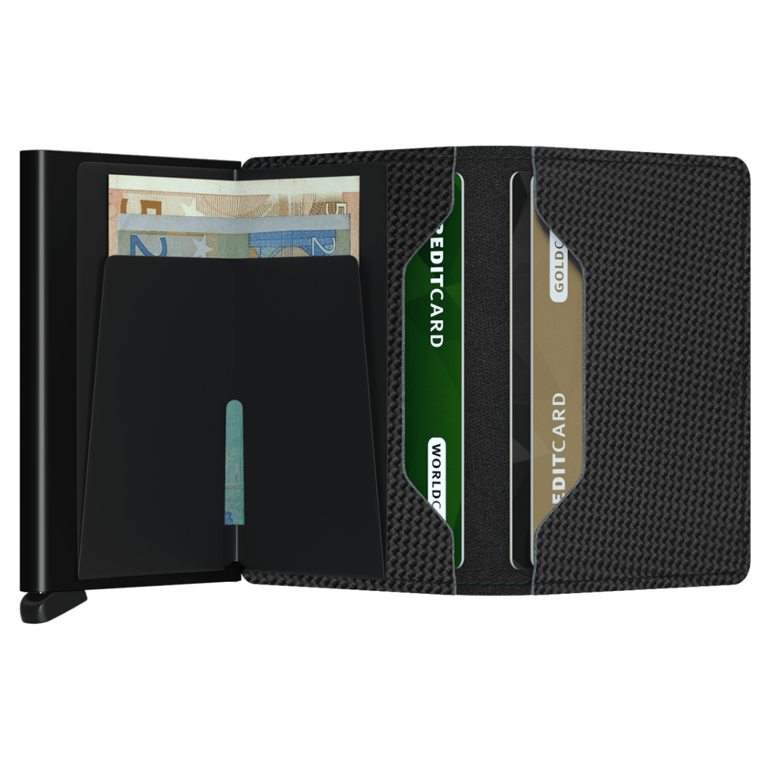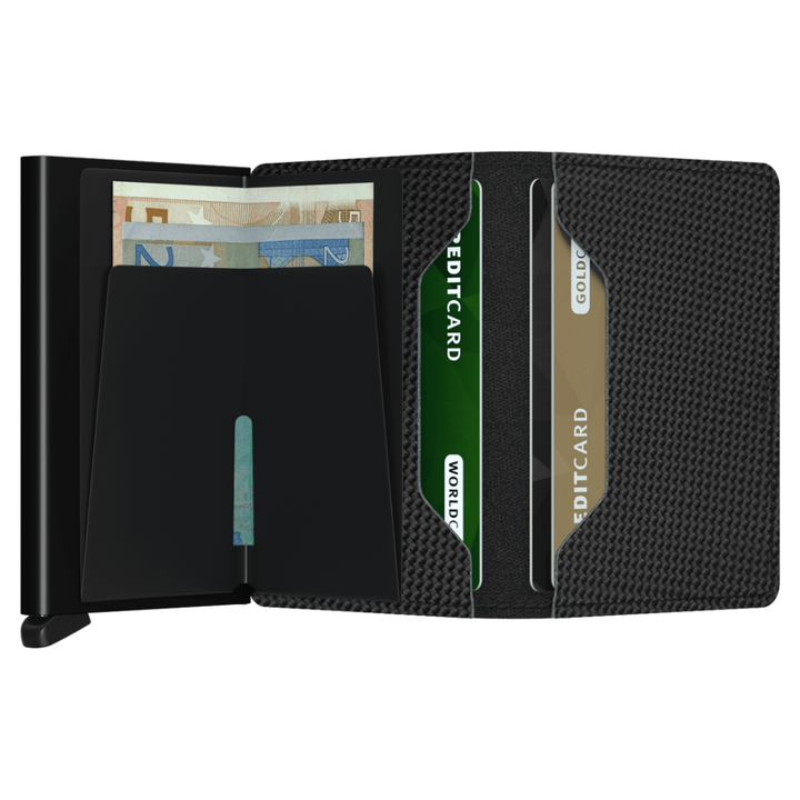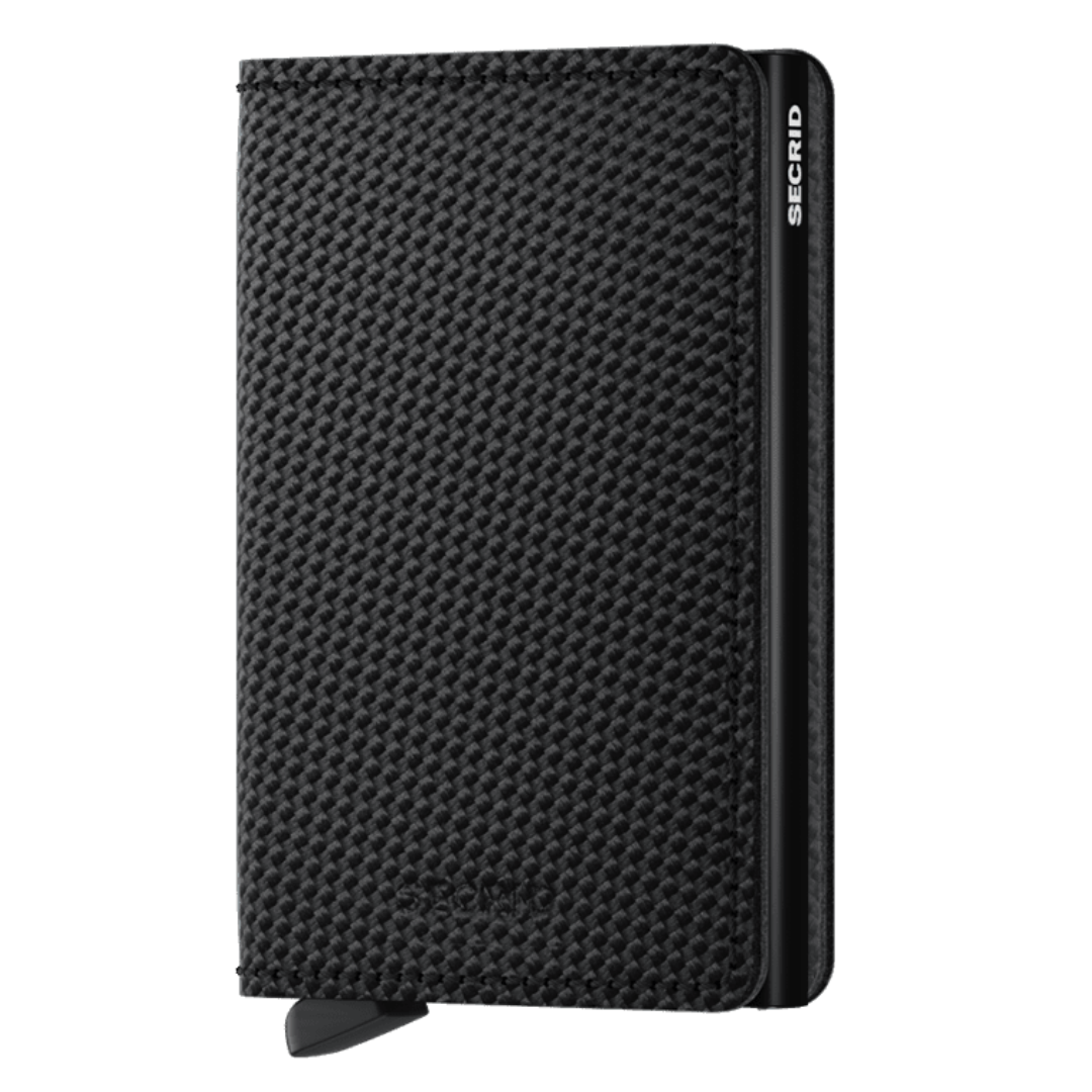 The Slimwallet is a modern take on the classic billfold. With its slim profile it fits perfectly into every pocket. The generously cut leather holds at least an additional six cards, banknotes and business cards. The patented mechanism allows you to slide out your cards with one simple motion, ready for immediate use. The aluminium protects from bending, breaking and unwanted wireless communication. Carbon The Slimwallet Carbon Black has a weave pattern. The weave pattern of carbon fibres inspired this treatment of the leather surface. Carbon is made in Germany from European cowhide. Holds: 4 embossed or 6 flat cards 6 extra cards Banknotes Business cards Receipts Size and weight: 68 x 102 x 16 mm 72 g