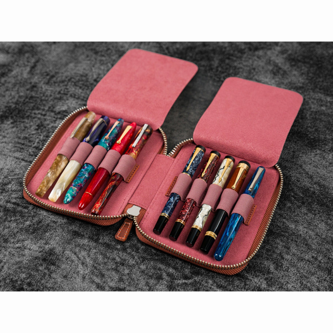 This Leather Zippered Pen Case has a velvet lined interior and holds up to 10 pens. When you want to carry your favorite pens, you want them protected in your bag, purse or pocket to avoid ink leaking everywhere or getting them scratched. This leather pen holder is great to protect your fountain pens and keep them safe.