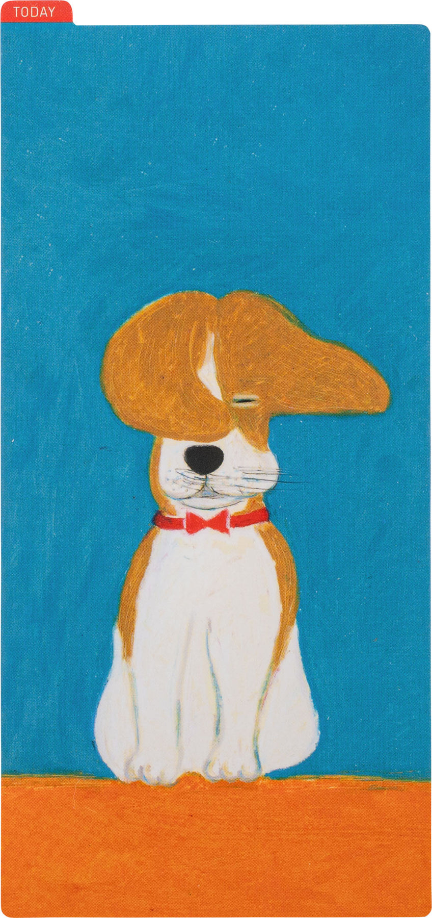 The Weeks size “Wind gust during a Stay command” design depicts a strong wind ruffling the ears and whiskers of a beagle dog as it is trying to sit still as being told to “Stay.” It is touching to see how patiently it waits, even in such a situation. The back of the pencil board is orange.