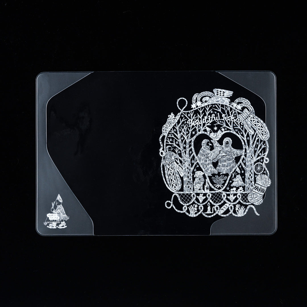 Snow falling on the trees, a warm sweater, and winged people dancing by the fire. The striking white color combined with the delicacy of the embroidery makes the work look like snow crystals. The quiet beauty of this work will enchant you, making you delighted every time you put your eyes on it.