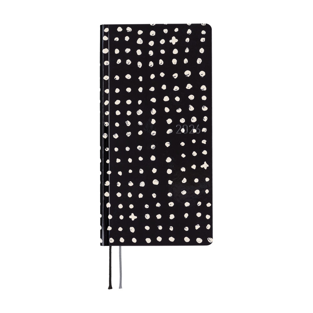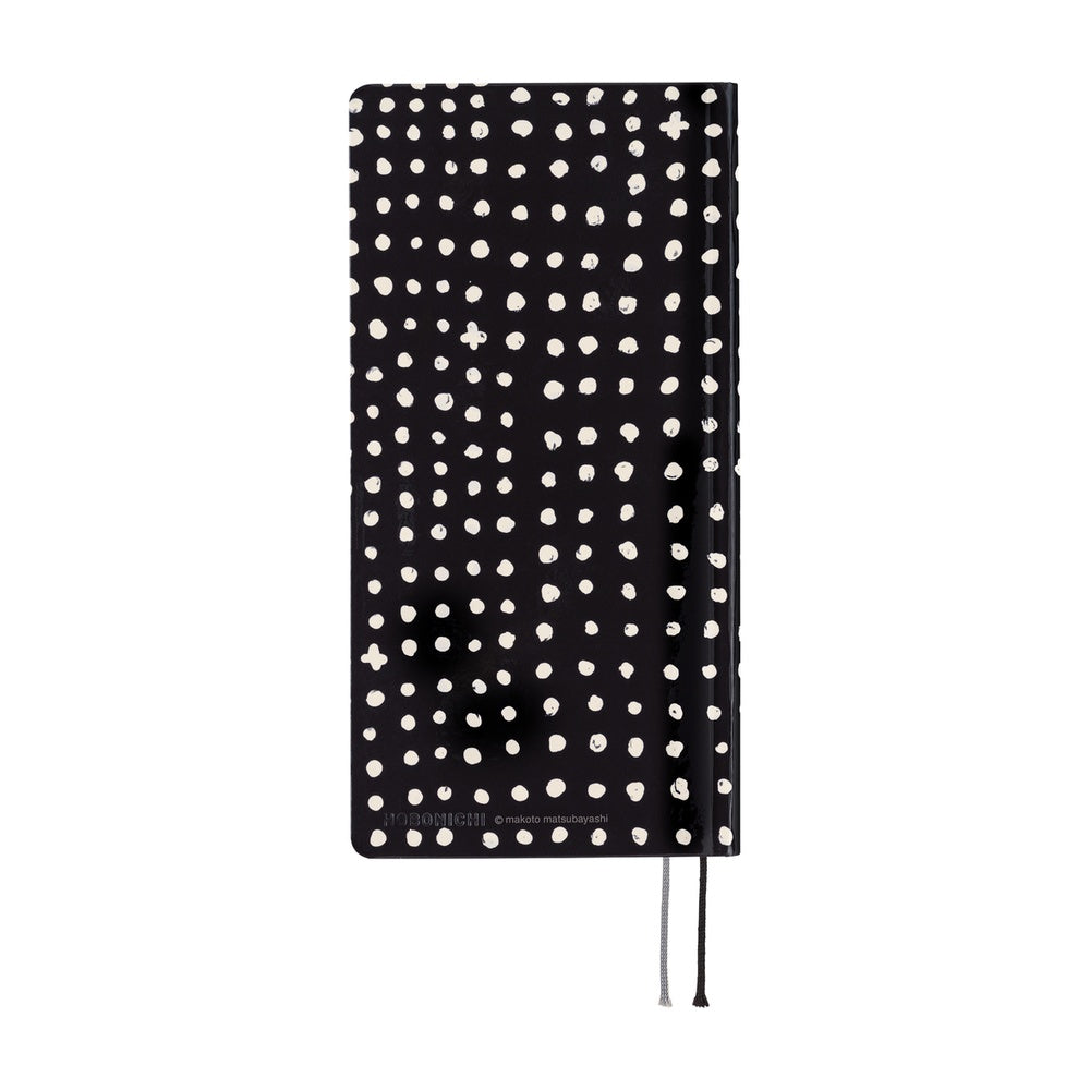 Painted with free-flowing brushstrokes, white dots stand out boldly against a black background. Though the design is refreshingly simple, with no extra embellishment, the subtle wavering and fading of the hand-drawn lines bring a gentle warmth to the overall look.