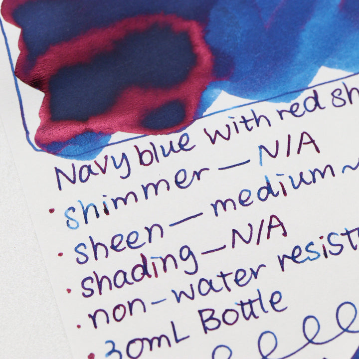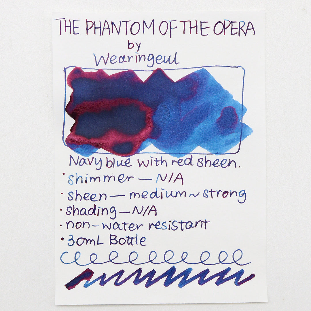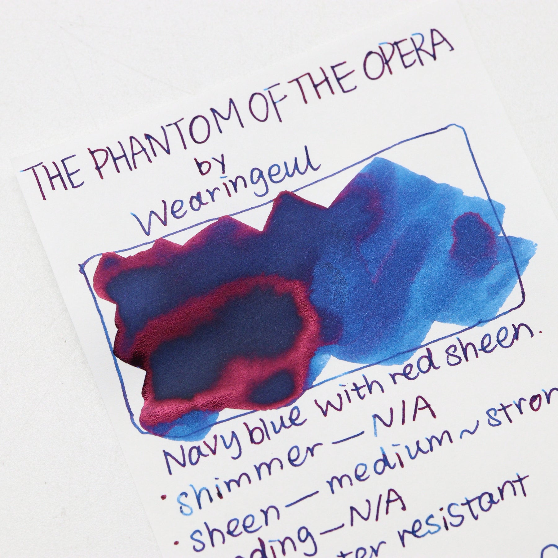 The Phantom of the Opera ink is an ink that exhibits a striking red border that appears on top of a dark cobalt blue base, resembling a single rose blooming in the cold, dim underground of an opera house.