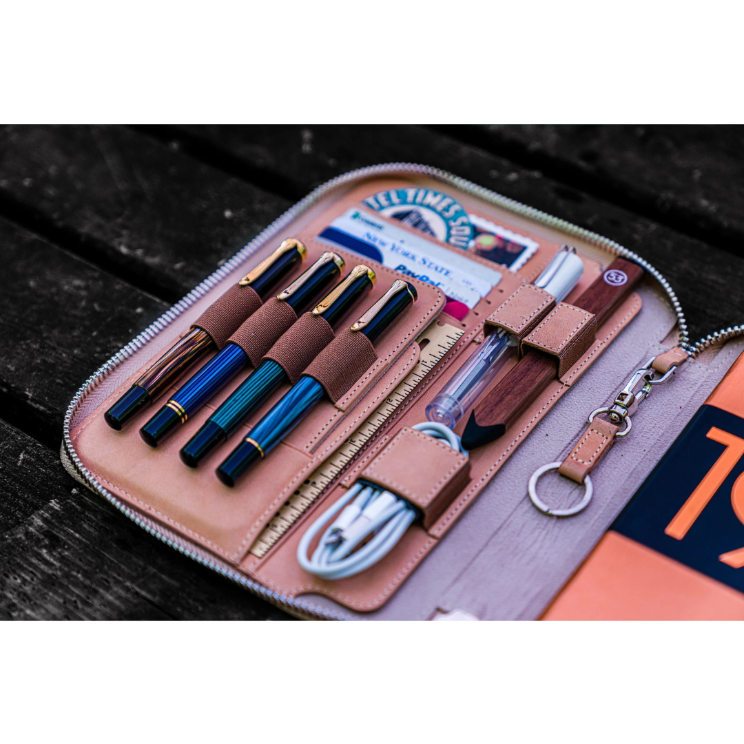 It has 4 credit card pockets and a long pocket that can hold your passport or your iPhone 6 / 7 / 8. Under the left side there is a sleeve for storing your iPad device. This beautiful leather zip portfolio has a removable 4 slot pen holder, an extra 2 pen slots and a slot for a charger, earphones or cable, along with a removable keychain in the middle of the cover. It makes a wonderful refillable leather journal cover.