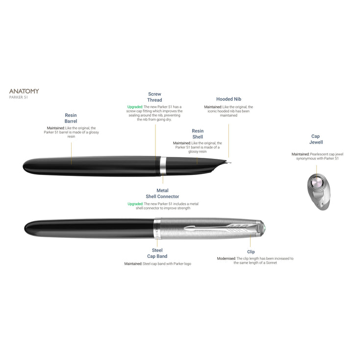 The Parker 51 Series fountain pen is crafted from resin with a bejeweled galvanized cap. Inspired by the to the historical model the end of the cap is galvanized and palladium plated.