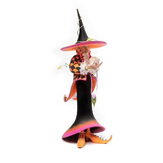 The Patience Brewster Crystal Ball Witch Figure will leave you spellbound. Her spooky style extends from her head (a black and orange hat wrapped with star accents) to her toes (orange button-top heels). In between, she wears a harlequin coat of black and orange, trimmed with fabric and beads, and carries her all-important crystal ball. Display this bewitching girl in a spot where she’ll get all the attention she deserves.