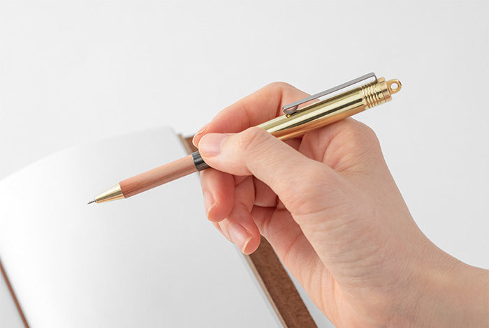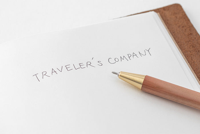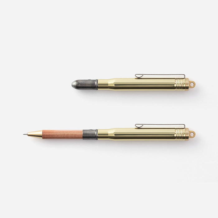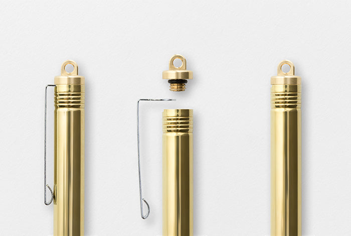 This unique ballpoint pen from Traveler's Company is made from brass, and is a Japanese reinterpretation of a classic American writing instrument. Each pen has black ink inside a wooden casing and features a solid metal clip and top loop for a key chain or lanyard. This compact ballpoint pen is a great way to write on the go! Brass body will develop a characteristic vintage look over time. Other colors available.