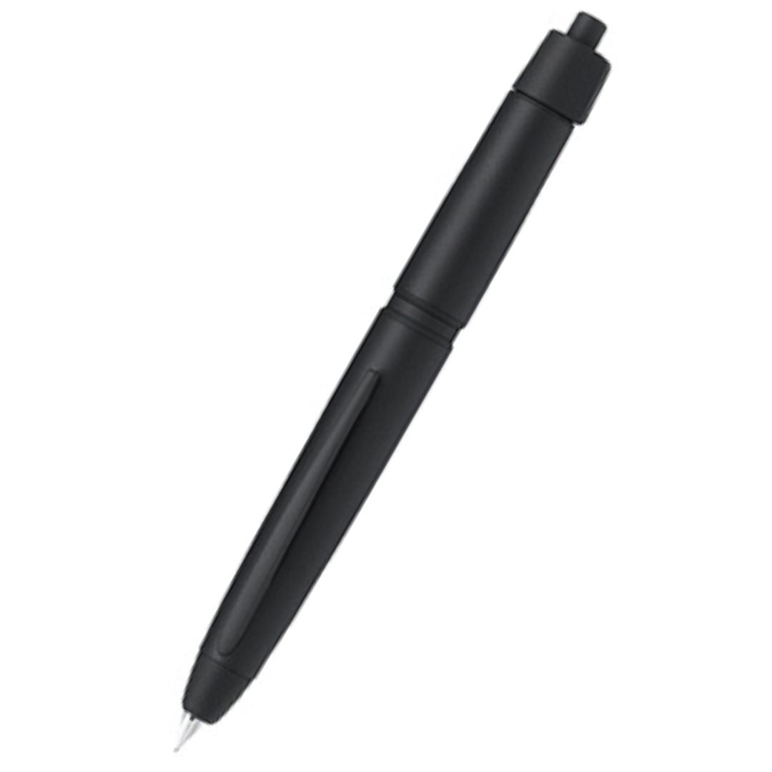 The pen features a matte black lacquer over aluminium and stainless steel body with matte black accents and a red stripe that highlights the twist mechanism. The pen has a smooth-writing 18k gold nib that is plated with rhodium and retracts with a simple soundless click and twist. The pen comes with a converter and a blue ink cartridge, and it can also use Pilot’s standard ink cartridges.