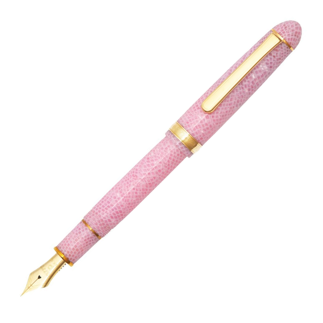 The Platinum Cherry Blossom Celluloid fountain pen features a beautiful cherry blossom pattern on a pink celluloid #3776 body with gold trim.