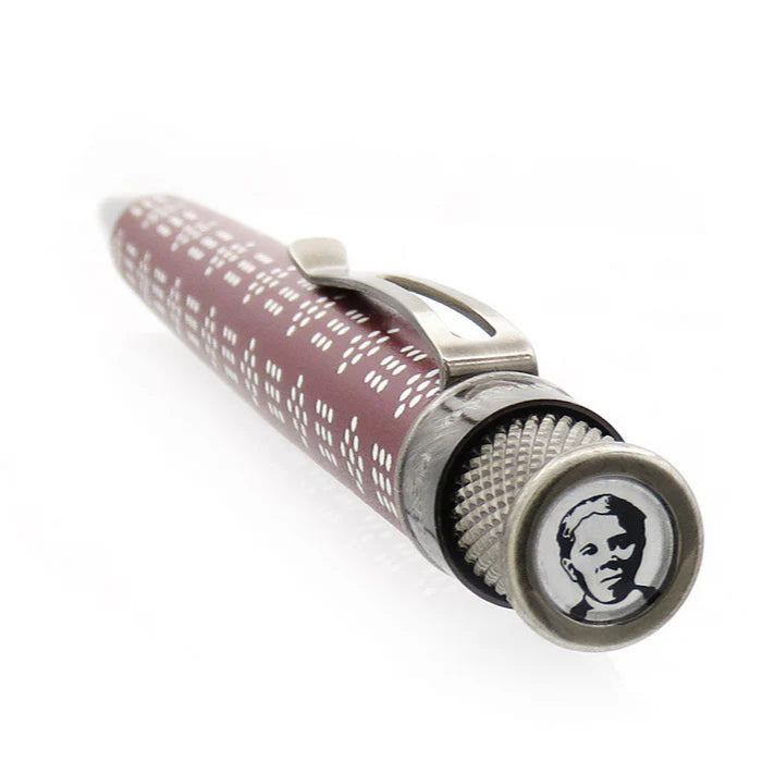 This Tornado rollerball pays homage to Harriet Tubman. The design reproduces the pattern from a headscarf in one of her most well-known photos. The stainless barrel has a lightly textured base coat with pattern printed on top and is finished with antique silver trim and her portrait on the finial. Each pen is packaged in a commemorative tube. May all who write with this pen be moved by Tubman's daring courage and generosity.
