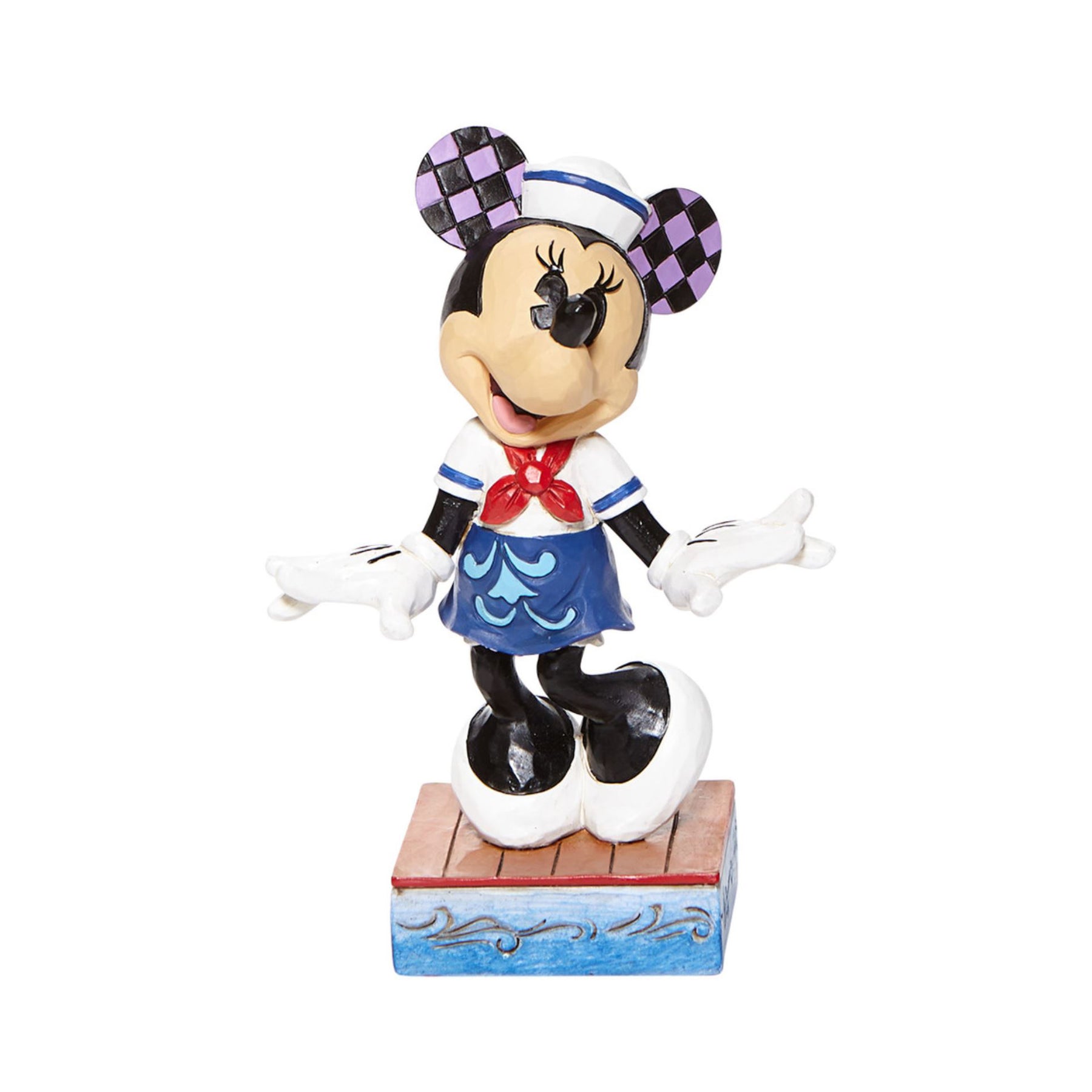Handcrafted in intricate detail, this colorful Minnie by Jim Shore will delight any Disney enthusiast. Hand-painted with folk art motifs, this fun-loving beautiful mouse is patiently waiting for Mickey to help her board the ship.