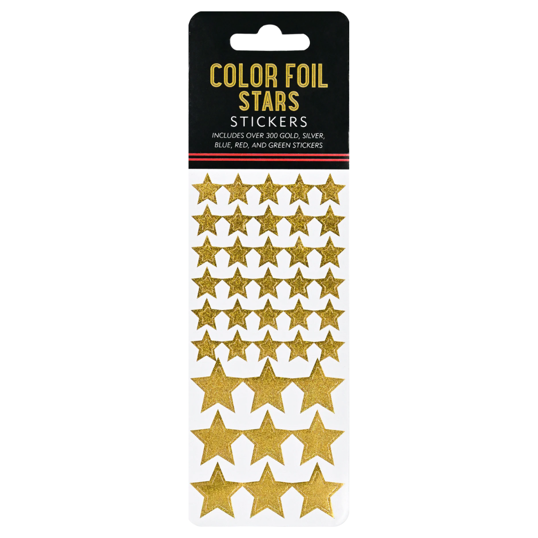 Here are hundreds of shimmering foil star-shaped stickers in 2 different sizes and 5 different colors: gold, red, silver, blue, and green!