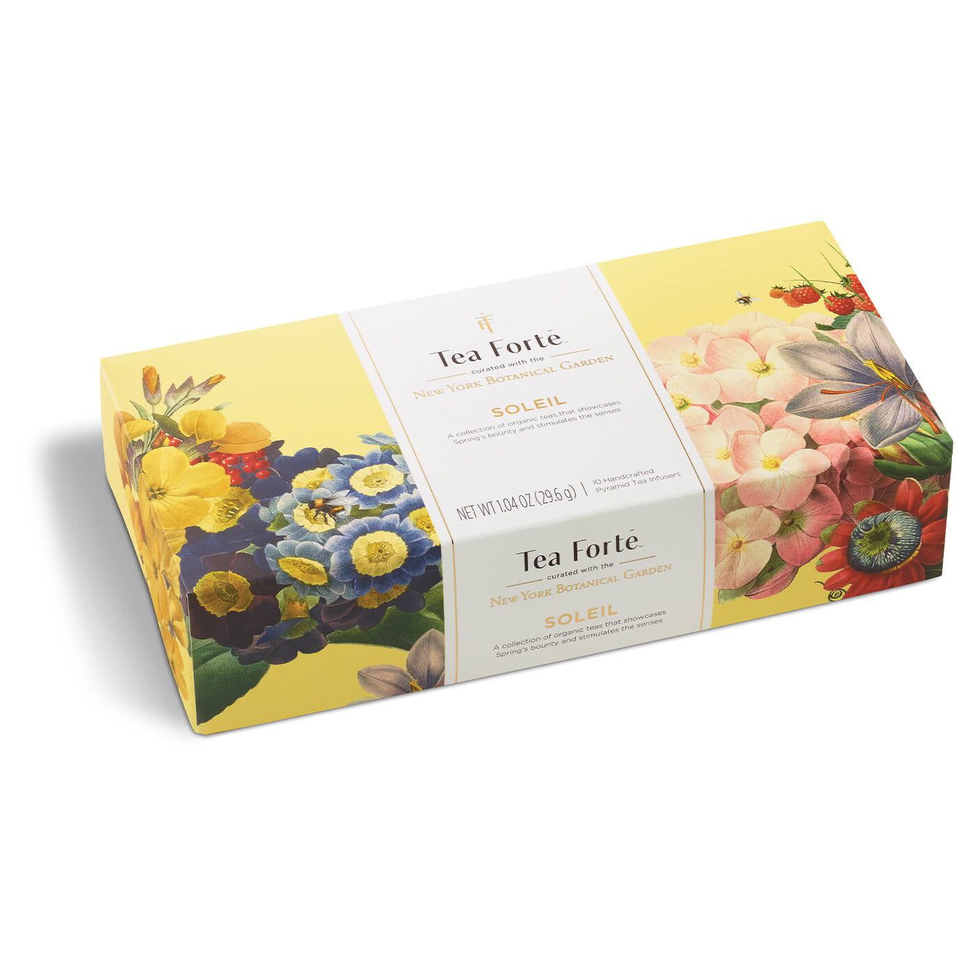 The Soleil collection is a collaboration with The New York Botanical Garden. The flavors were inspired by a lush curation of flowers and fruits that can be found in the botanical garden on a warm spring day. The collection features blends were hand-selected to showcase the natural aromatics and sumptuous flavor of Spring’s bounty. The Soleil Petite Presentation Box contains 10 pyramid infusers, two each of the following blends:
