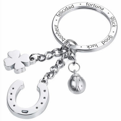 KEYRING WITH FOUR LEAF CLOVER, HORSE SHOE, AND LADYBUG CHARMS