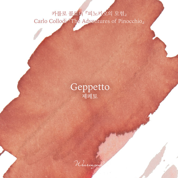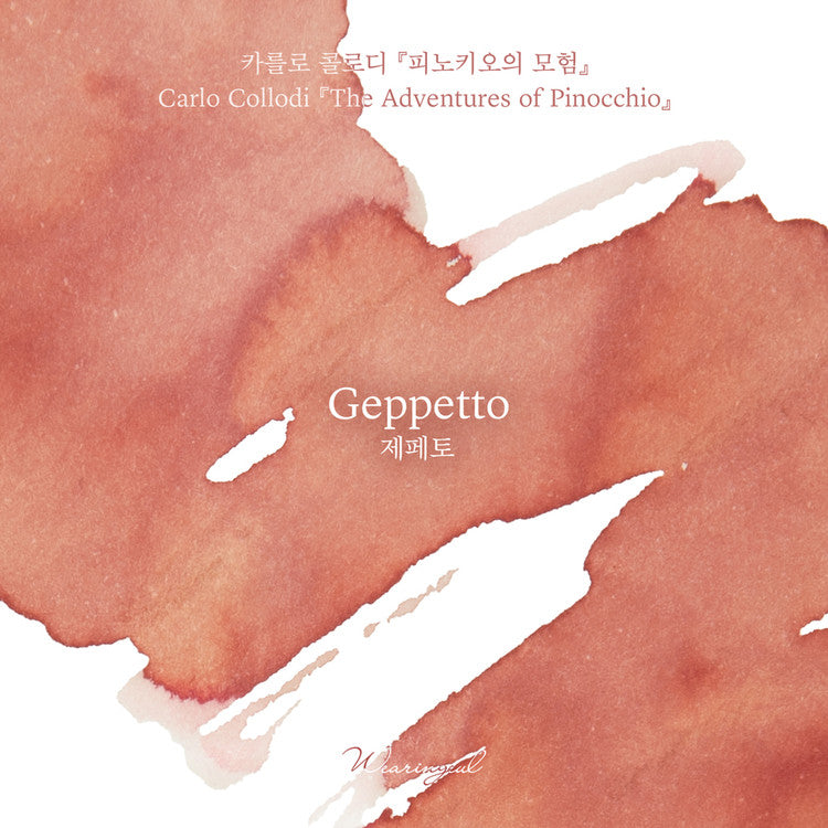Carlo Cillodi "The Adeventures of Pinocchio, Ink depicting Geppetto, the caring father who looks after Pinocchio with a warm heart, no matter what mishaps may occur. This warm and gentle ink showcases a dramatic separation of yellow tones in a clear blush red, creating a soft and inviting colour