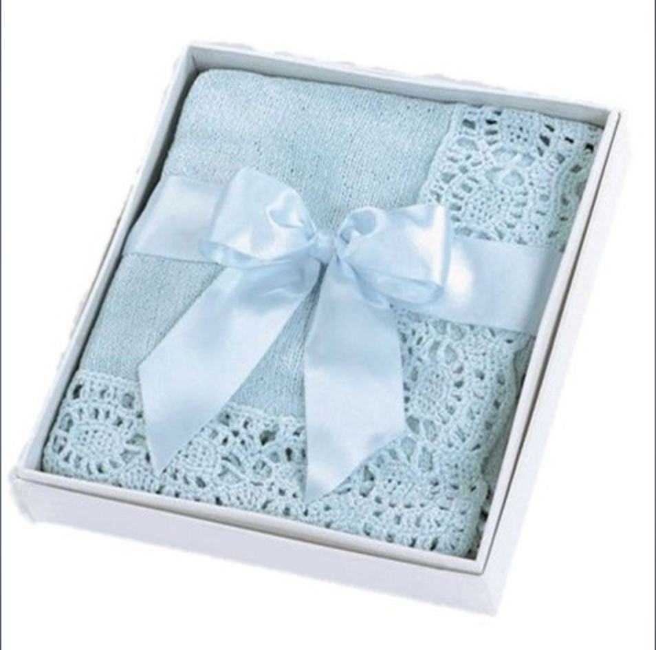 Pamper your baby boy with this lovely heirloom-quality crib blanket. This velvety smooth baby blue chenille blanket features a crochet edging. It comes folded in a gift box and tied with a baby blue satin ribbon. Measures 30" x 40."