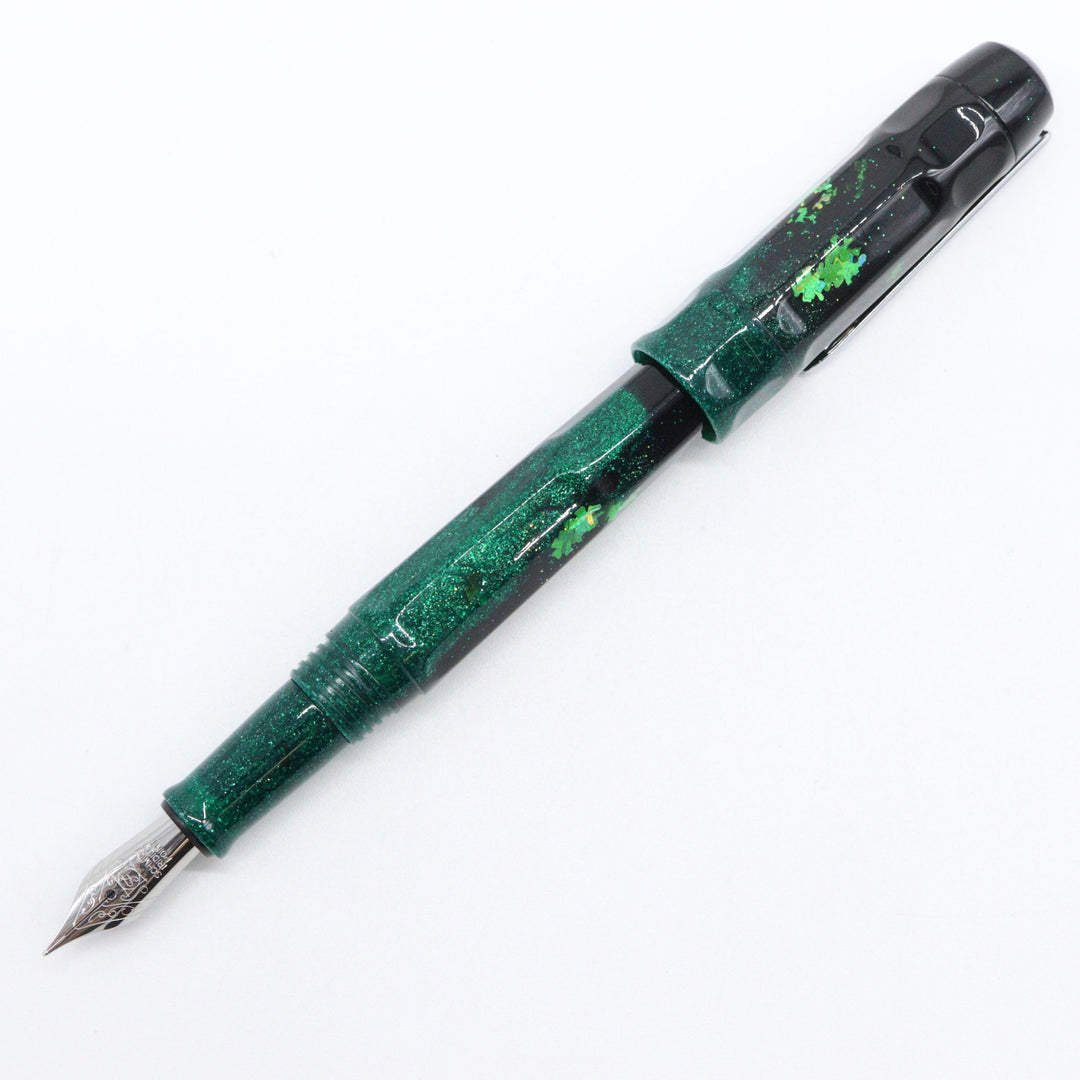 Design Inspiration: Featured in the Talisman Collection, The Four Leaf Clover fountain pen is infused and takes inspiration from the Four Leaf Clover, which are often found in the Northern Hemisphere and commonly known to represent good fortune. This delicate plant plays an integral part in Irish tradition, Christian tales, in English literature, contains supernatural powers to ward of evil spirits and allows the bearer of the clover to be able to see small fairies. With a black base, sprinkled with emerald green sparkles and four leaf clovers, this pen is a one-of-a-kind project from BENU. Bring luck with you with this mystical and mesmerizing plant!