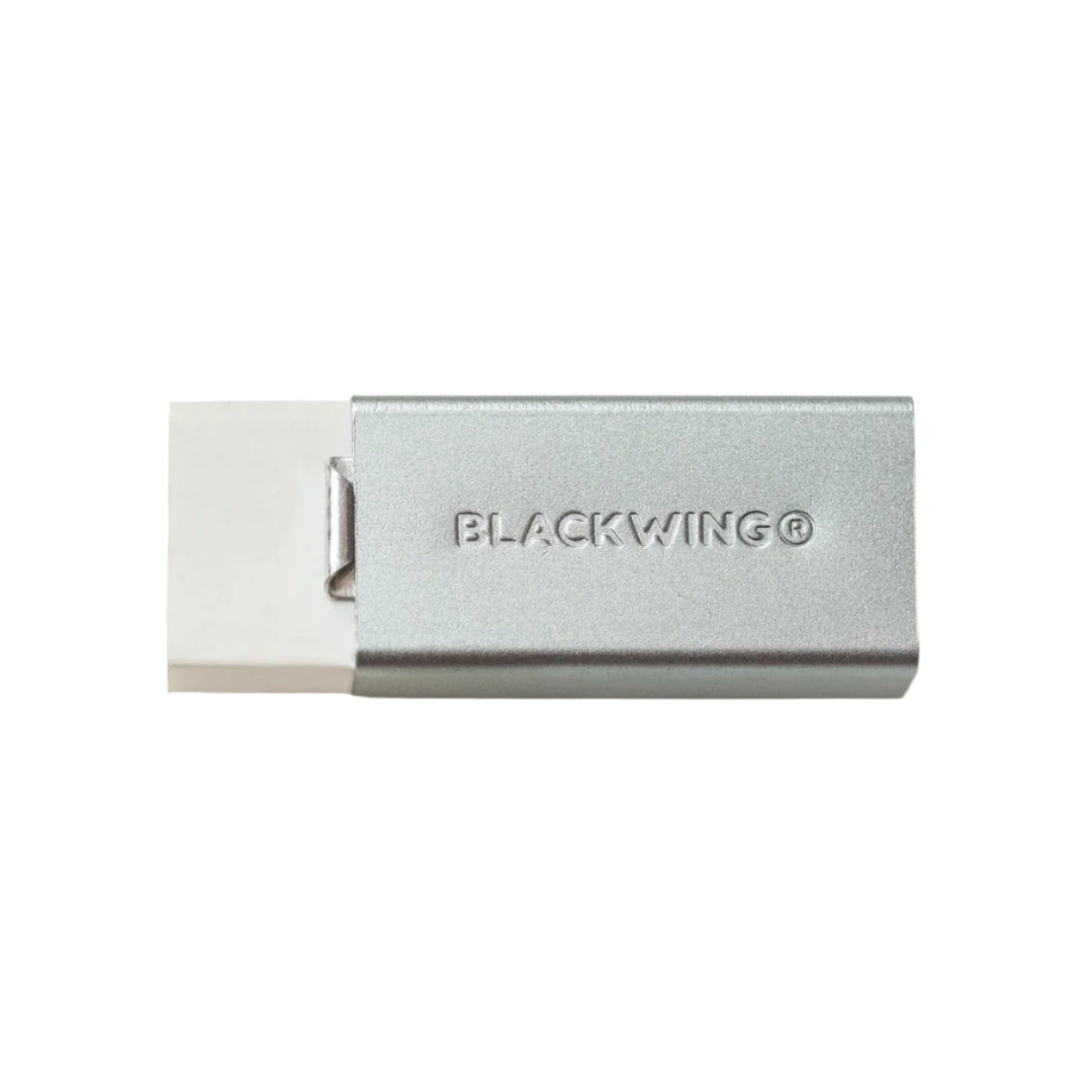 The eraser is made of a special soft material that erases the dark lines of our graphite cleanly and easily. The holder is made of durable aluminum that lets you get a solid grip while erasing. It also includes a jumbo-sized version of the iconic Blackwing clip, so you can extend the eraser as you use it.