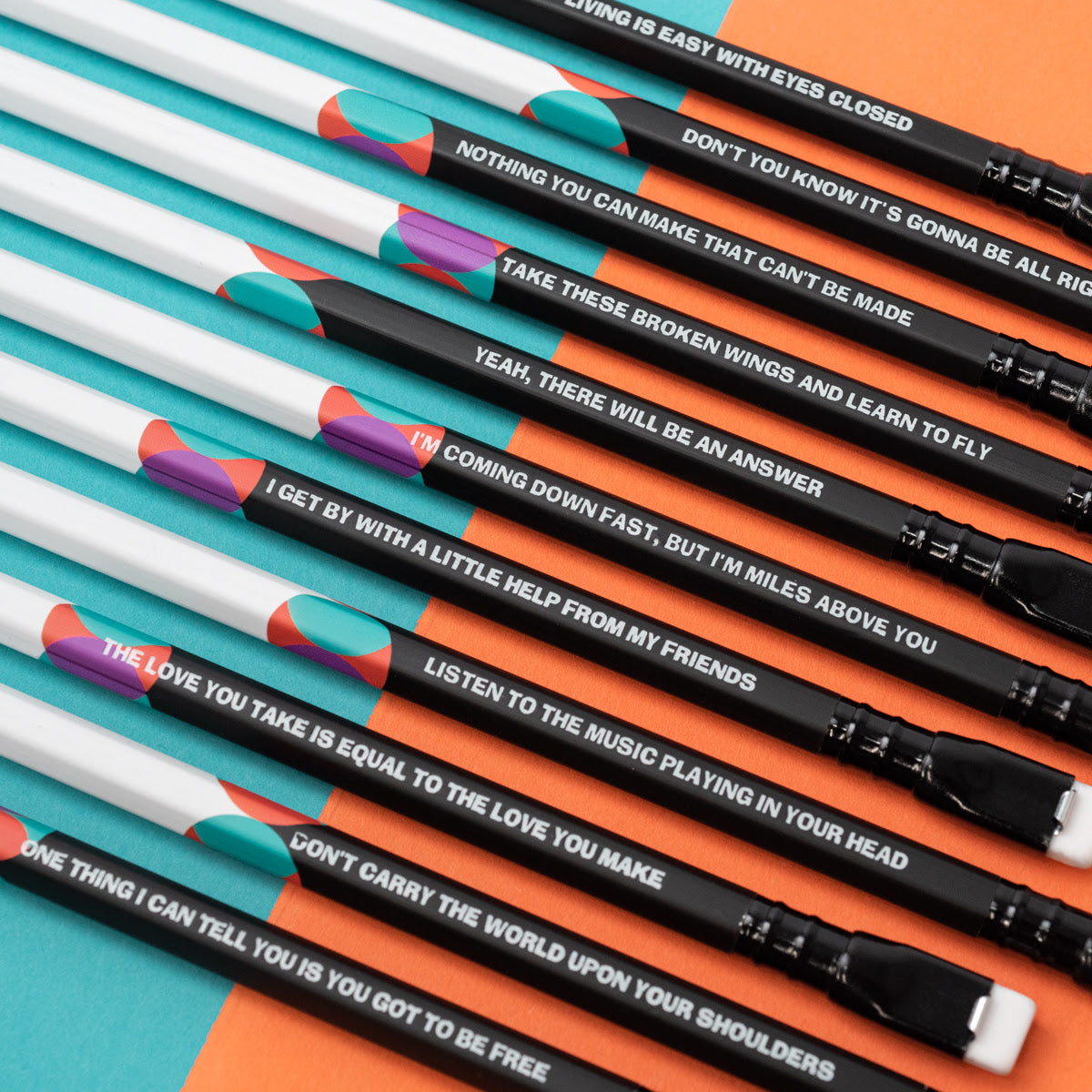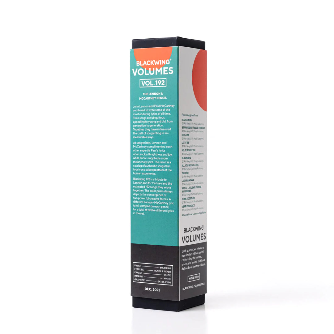 Blackwing 192 is a tribute to Lennon and McCartney and the estimated 192 songs they wrote together. The color prism design depicts the convergence of two powerful creative forces. A different Lennon-McCartney lyric is foil stamped on each pencil, for a total of twelve different lyrics in the set. Each pencil contains the extra-firm graphite.