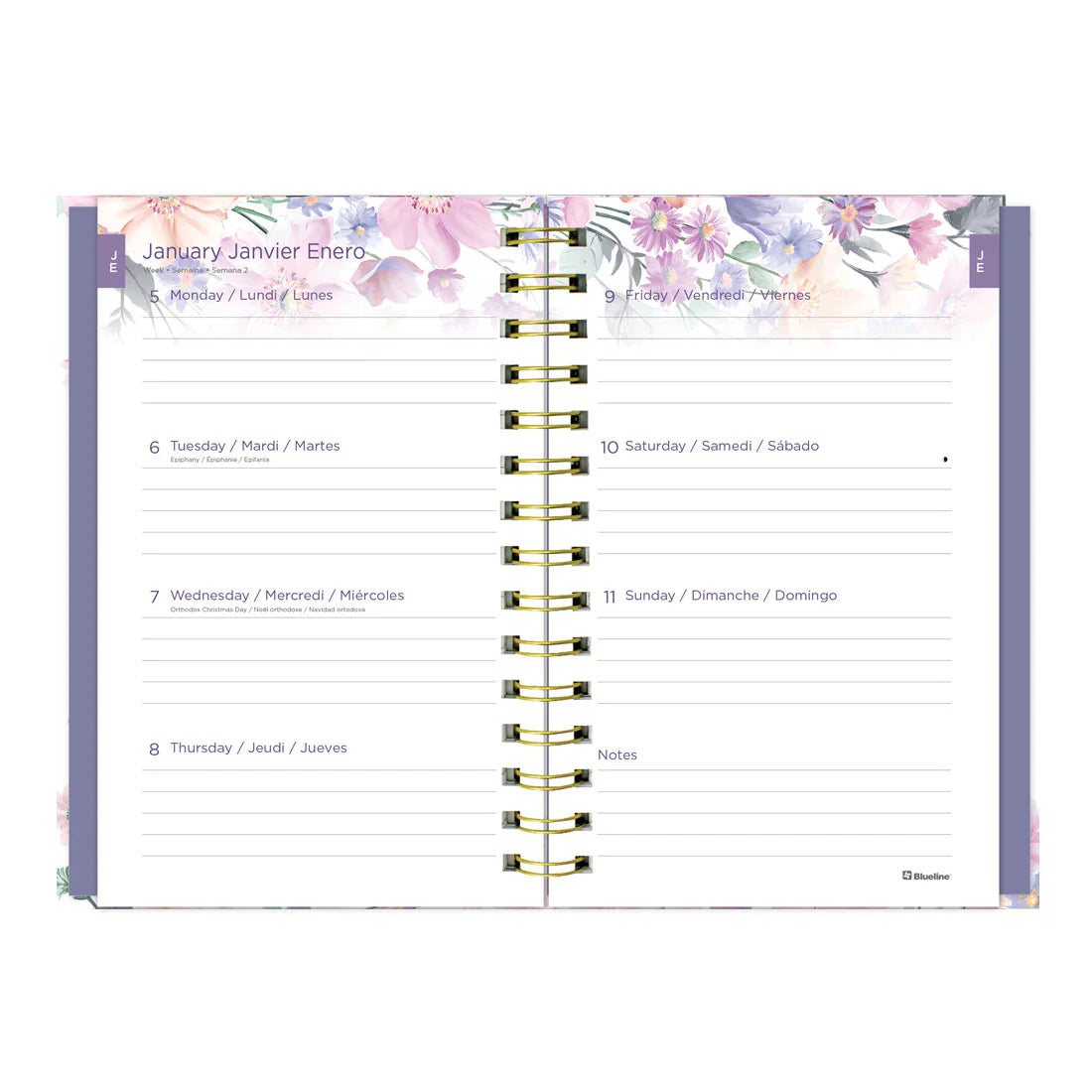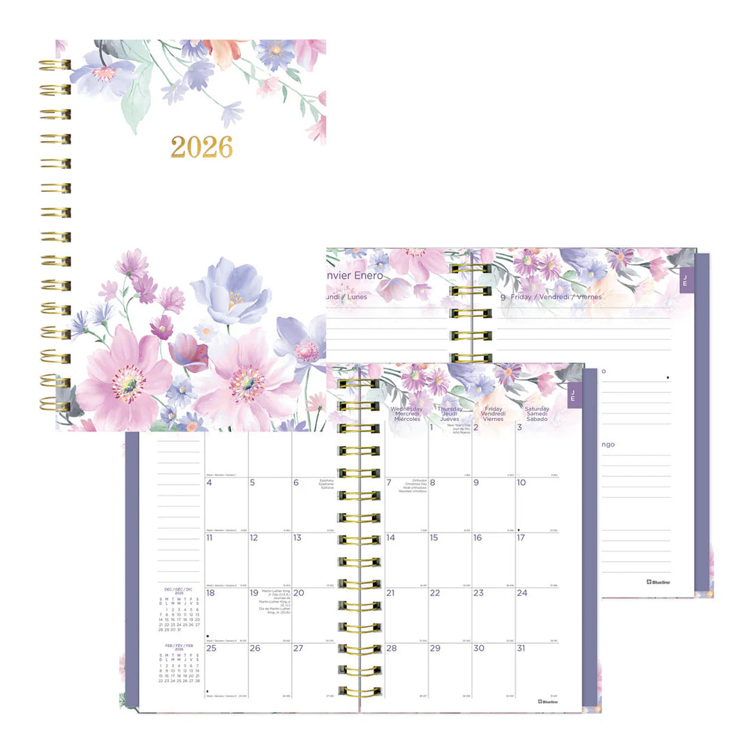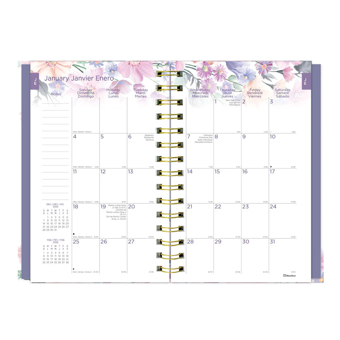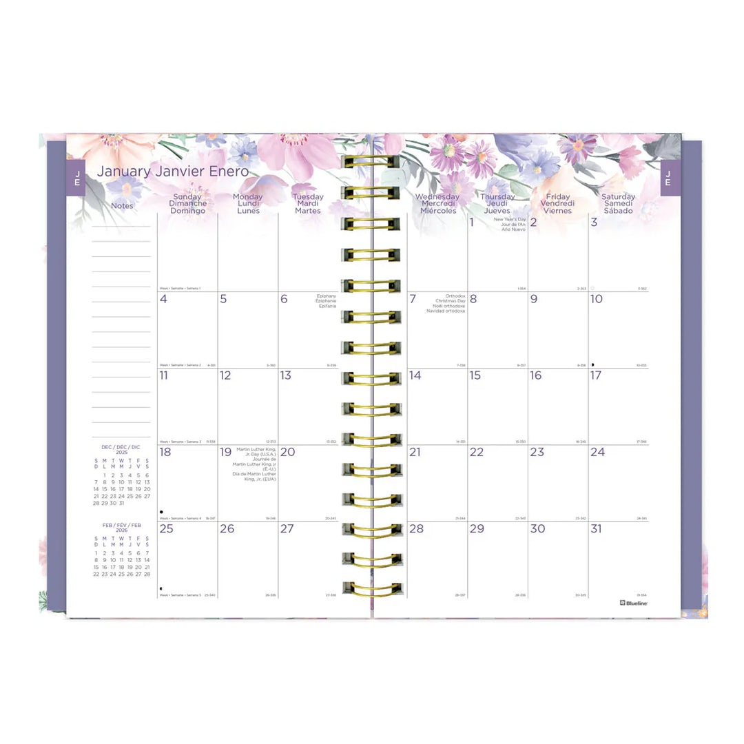 The Blueline® Passion Colourful Weekly/Monthly Planner features 12 months of planning, spanning January to December 2026. FEATURES: four-colour interior brightens up planning throughout the year. One week per two-page spread, ruled space for each day of the week. Monthly planner before each month with notes area on each spread. DURABLE two-piece hard cover constructed with gold twin-wire binding provides a flat, sturdy writing surface. CONTAINS: numbered weeks, reference calendars of past and following months, daily countdown of passed/future days (Julian dates), highlights holidays and moon phases. Self-adhesive monthly tabs provide for quick, easy access. Double-sided pocket optimizes storage. INCLUDES: two-year calendar, project planner, expenses, monthly goals, to do, passwords, and annual event planner, ruled note pages, dotted note pages, and contacts (telephone/address/e-mail) section. SIZE: 11" x 8.5". Colourful Passion Floral cover design. Trilingual: English, French and Spanish.