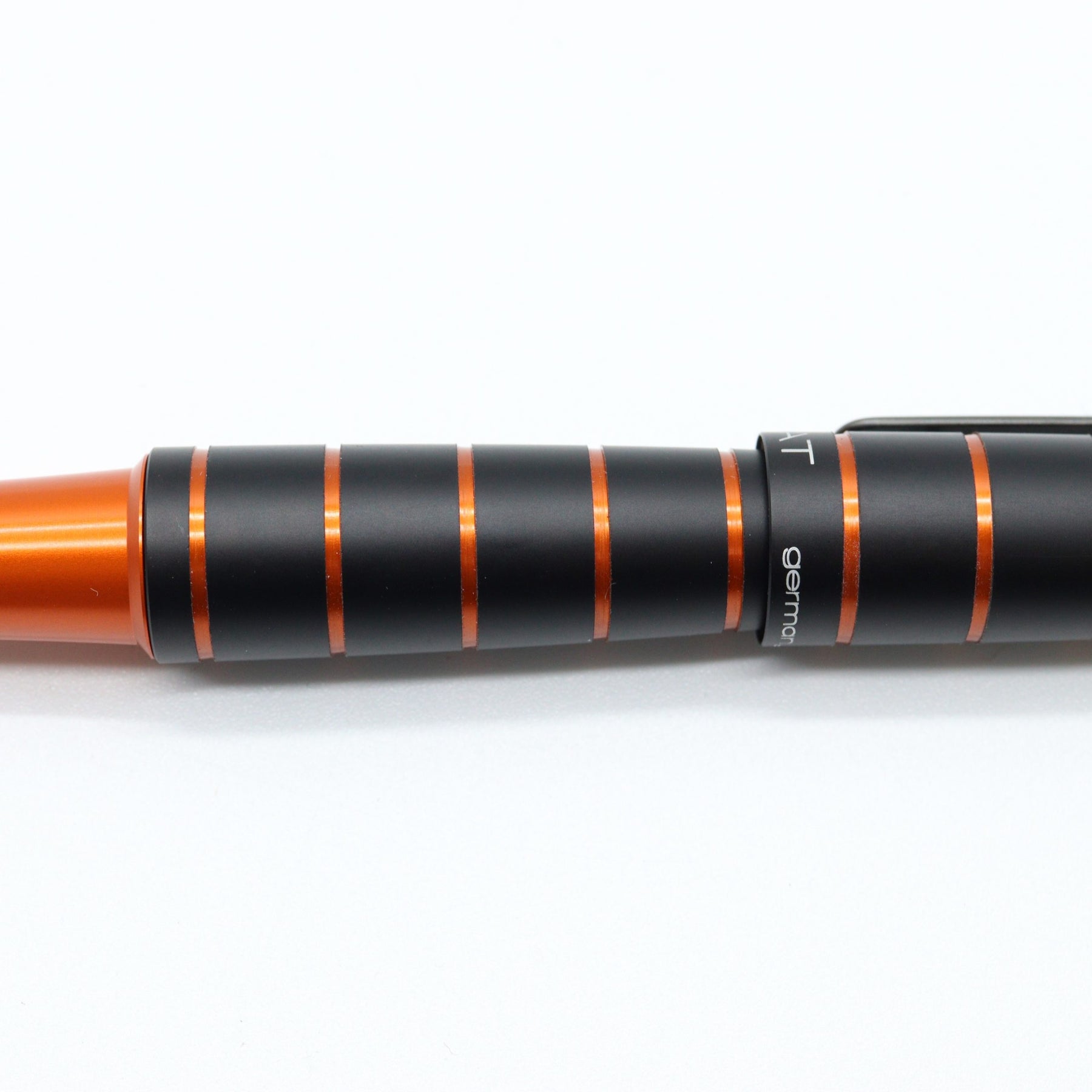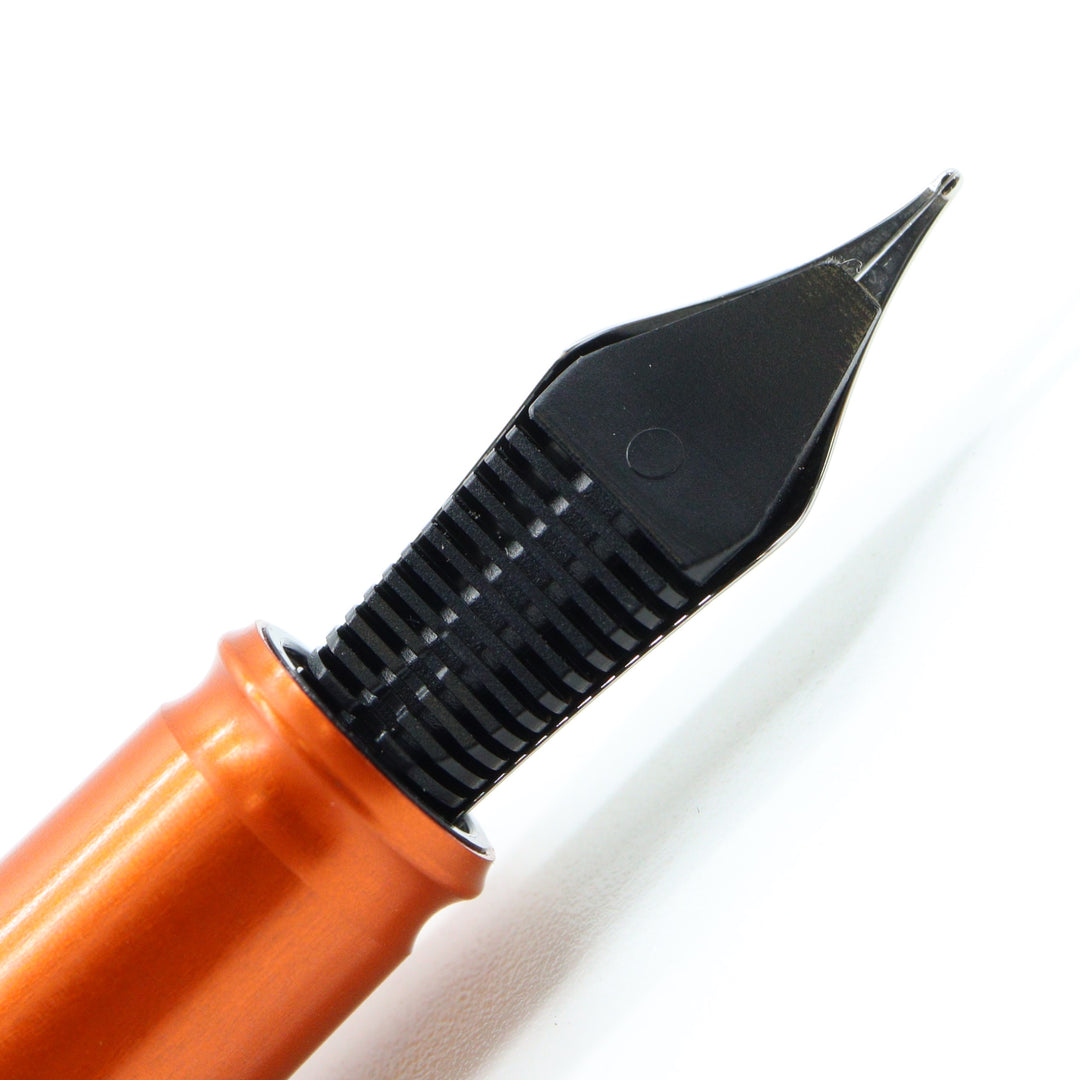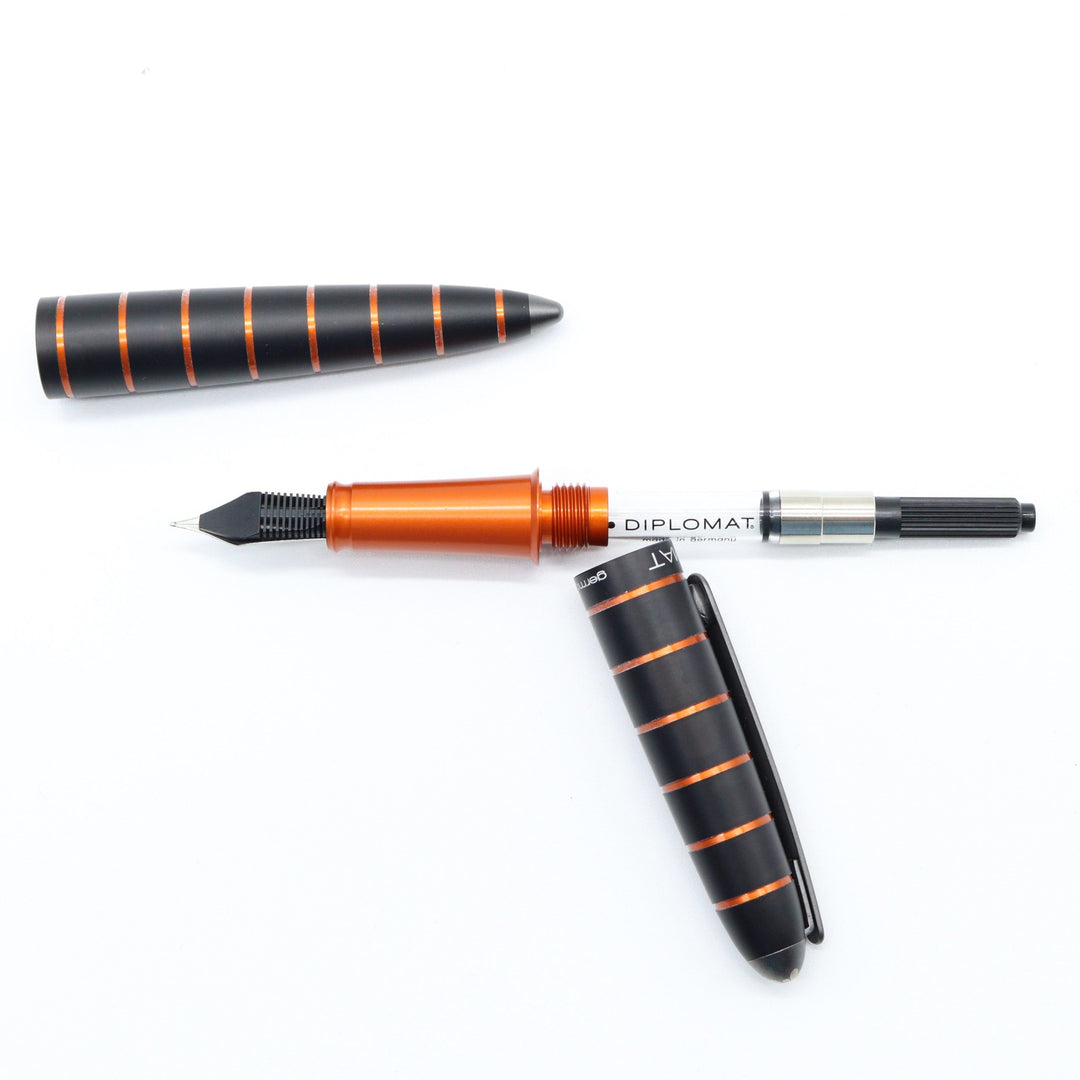 Body Material: Aluminium Nib Material: Steel Available Nib Size: Fine and Medium Cap: Snap-on Postable: Yes Ring-link depressions on barrel and cap Color: Black and Orange Approx. Sizes in cm Body: 12.8 Cap: 6.4 Overall: 13.9 Posted: 15.9 Approx. Sizes in inches Body: 5.05 Cap: 2.52 Overall: 5.49 Posted: 6.27