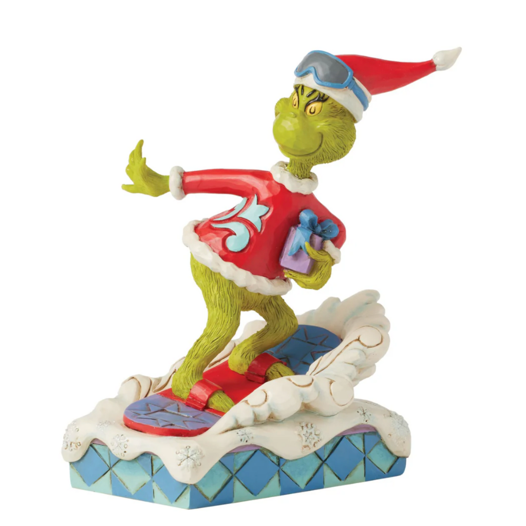 In this action-packed Jim Shore design, the Grinch steals presents in style as he weaves through the snow on a detailed snowboard, sporting goggles and a sassy smile with his Santa disguise. Put the mischief in Christmas with Jim Shore!