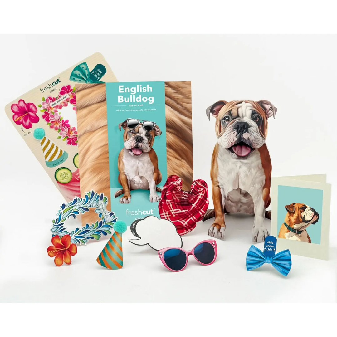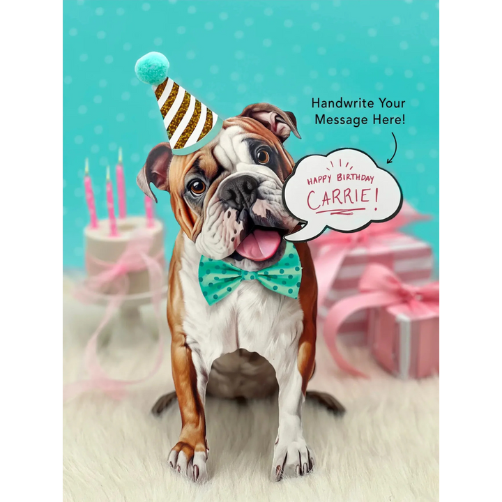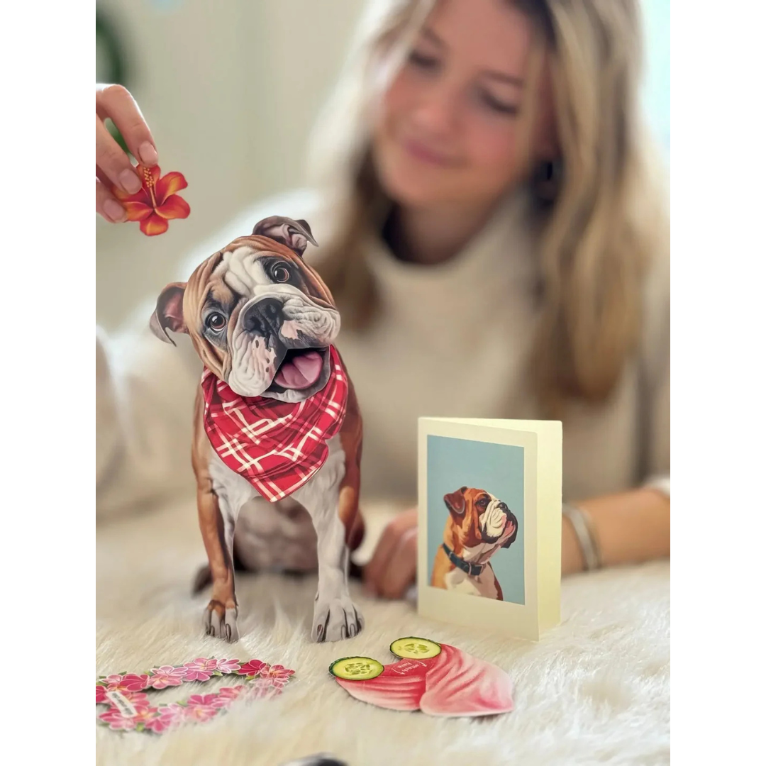 • This beloved bulldog comes with a matching notecard, a mailing envelope, whimsical interchangeable accessories, and a customizable speech bubble so you can add your own wonderful woof