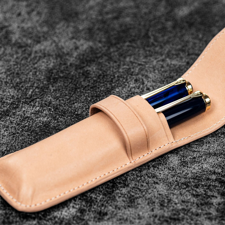 Our Two Pen Leather Flap Pen Case will keep your precious pens from getting scratched, ruined, or from leaking in your bag or jacket pocket. Suitable for most Fountain pens and other type of pens.