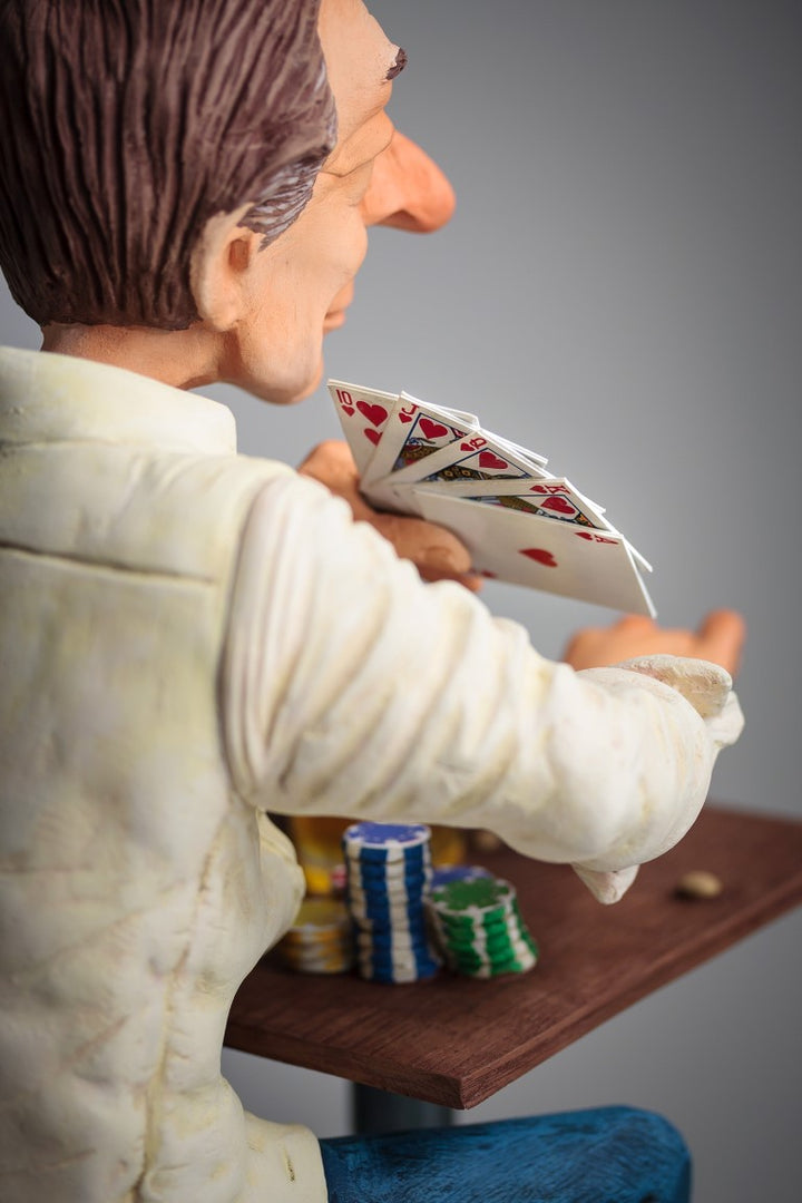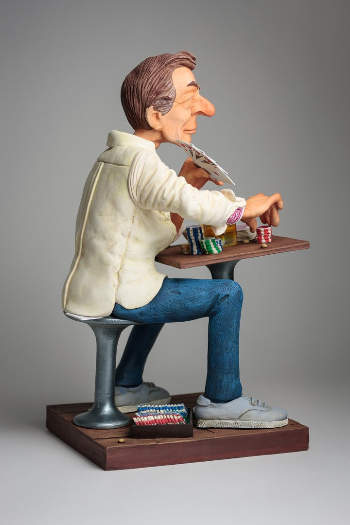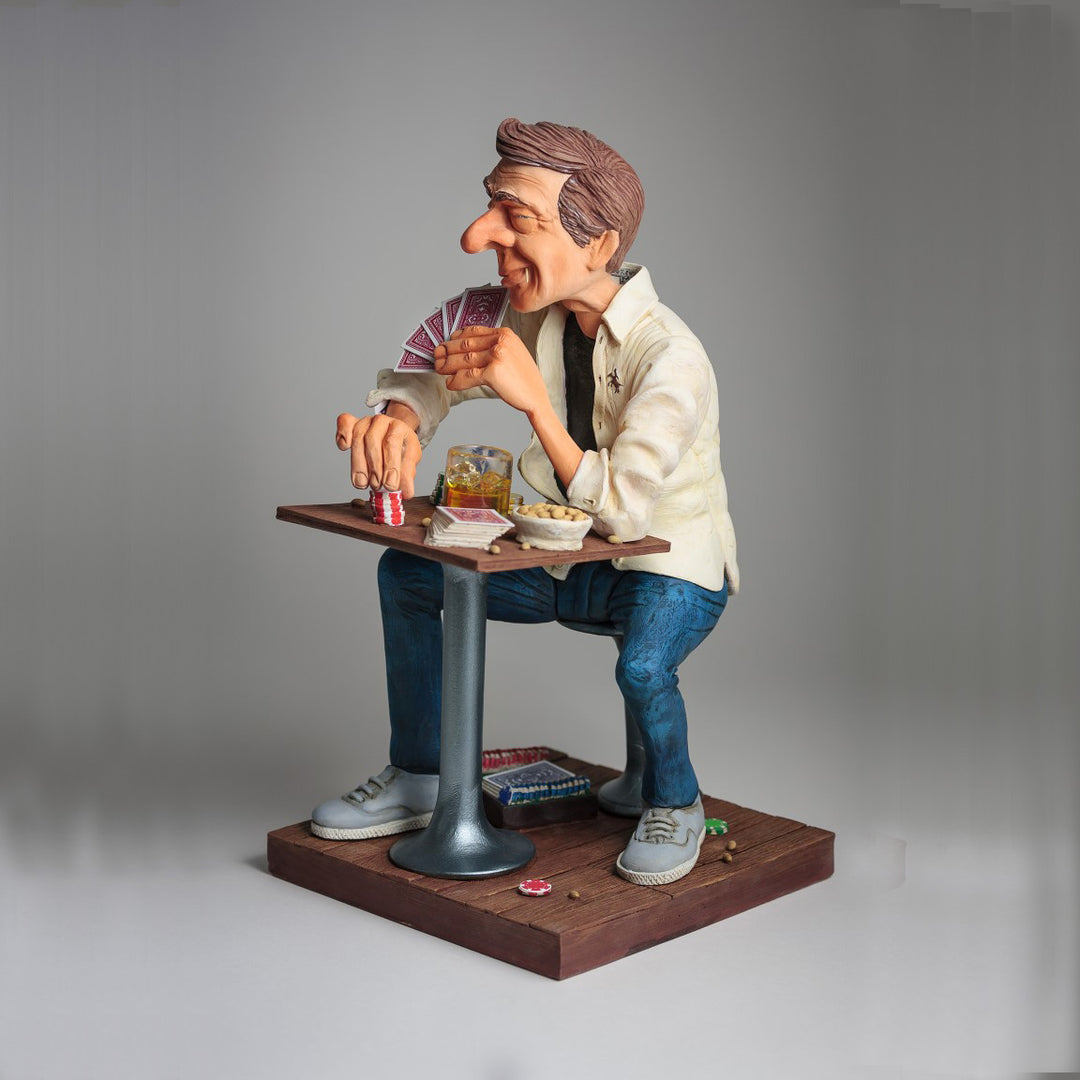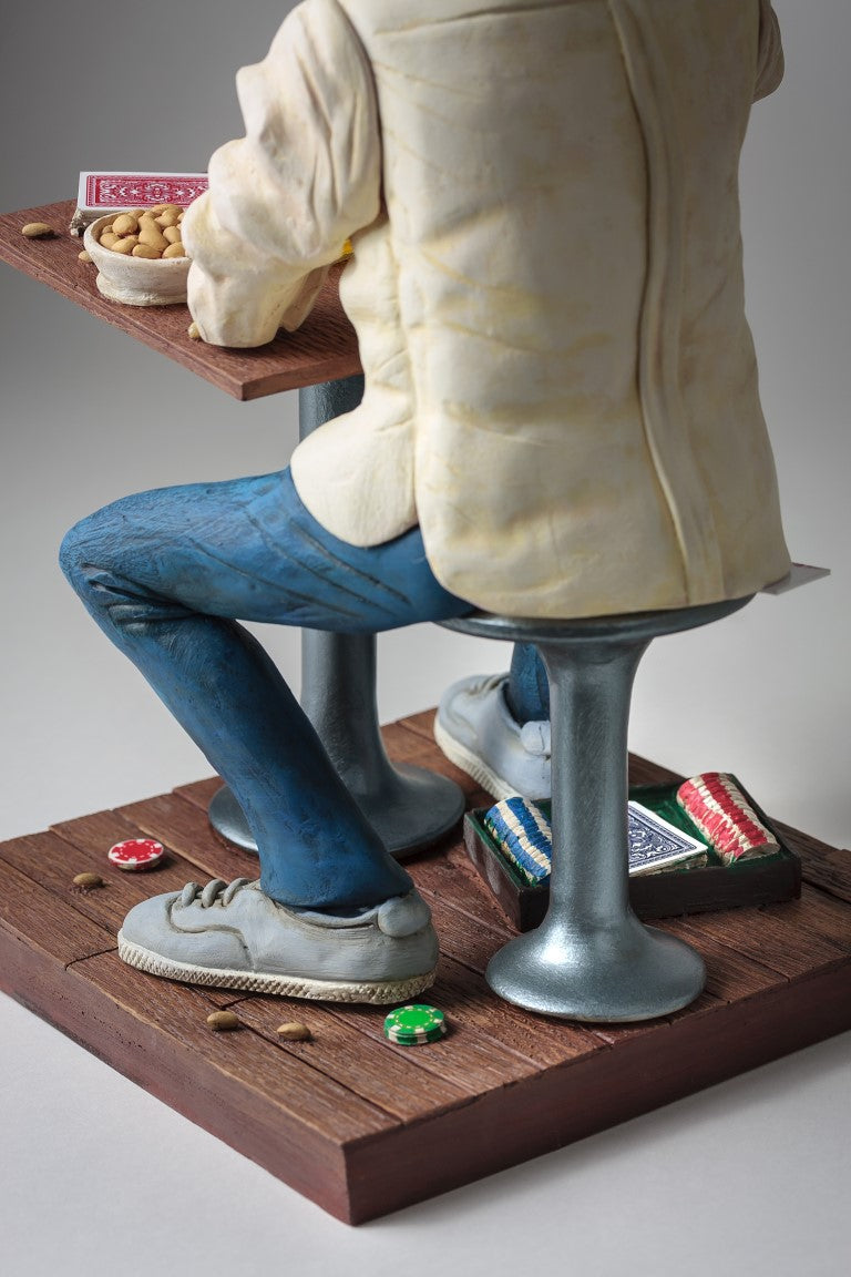 Mr. Poker Face Sculpture by Guillermo Forchino. This sculpture is a finely crafted, highly detailed work of art from the Guillermo Forchino collection. You will be very pleased with the quality of this amazing statue. The sculpture is cast in Polystone which is composed of polyurethane, resin, and mixed with powdered stone additives that give it added weight and a porcelain or "stone-like" feel. Polystone is very durable and delivers a cleaner, more substantial representation of an original sculpture than other common materials. Unicorn Studio uses polystone because it has an incredible ability to capture the most minute detail, making it unsurpassed in collectible manufacturing materials. Size: 12.75"H
