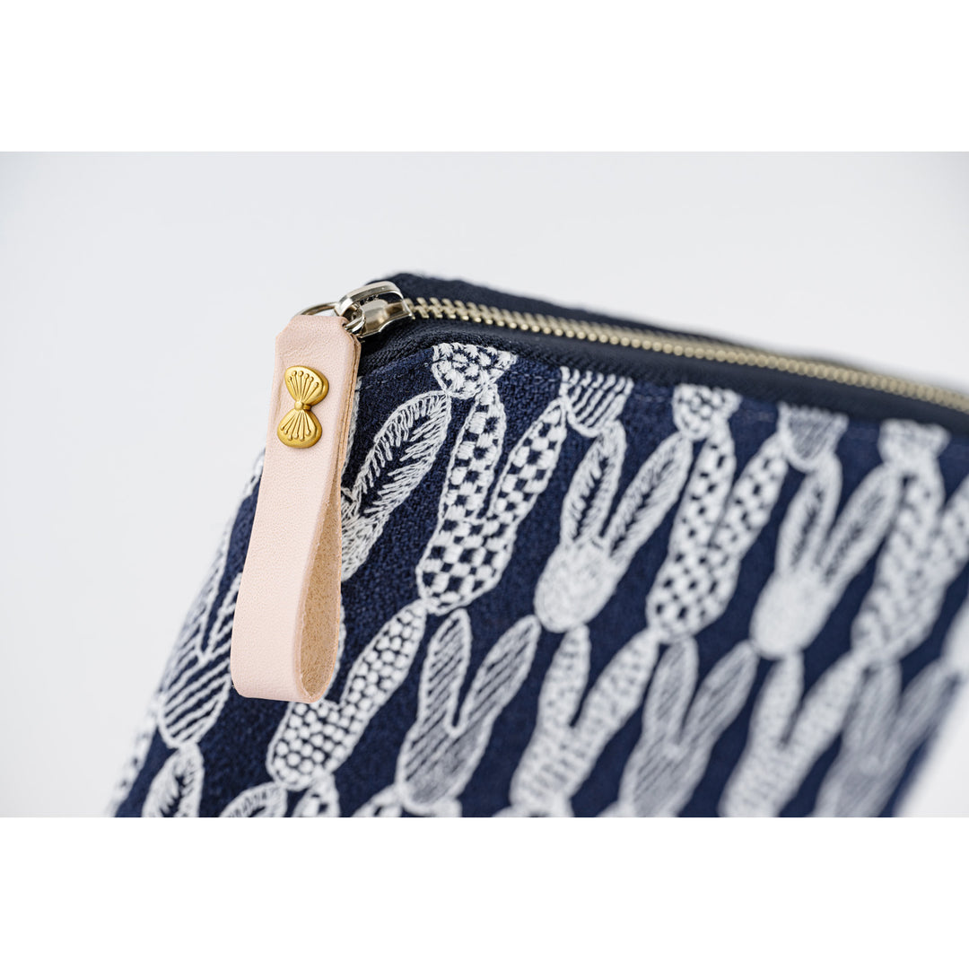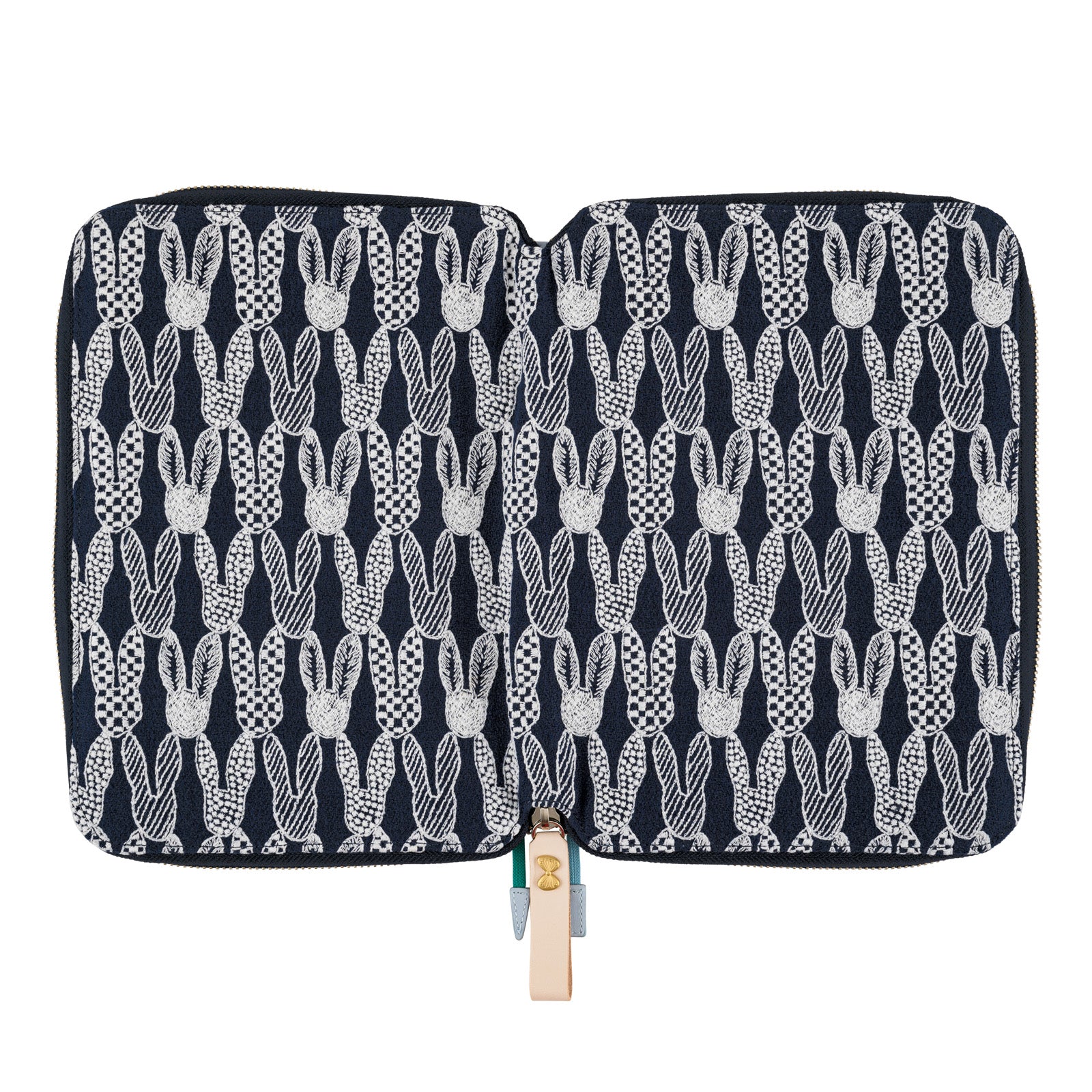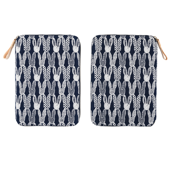 The "pomppia" cover by minä perhonen features an adorable continuous pattern of rabbit faces, symbolizing the connection between living beings and events. The navy linen fabric, embroidered with white thread, creates a crisp, calming design with a gentle touch. The cover includes light gray interior, two bookmarks in pale blue and green, and a natural leather zipper pull with a butterfly charm for a joyful, playful feel.