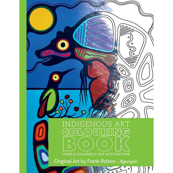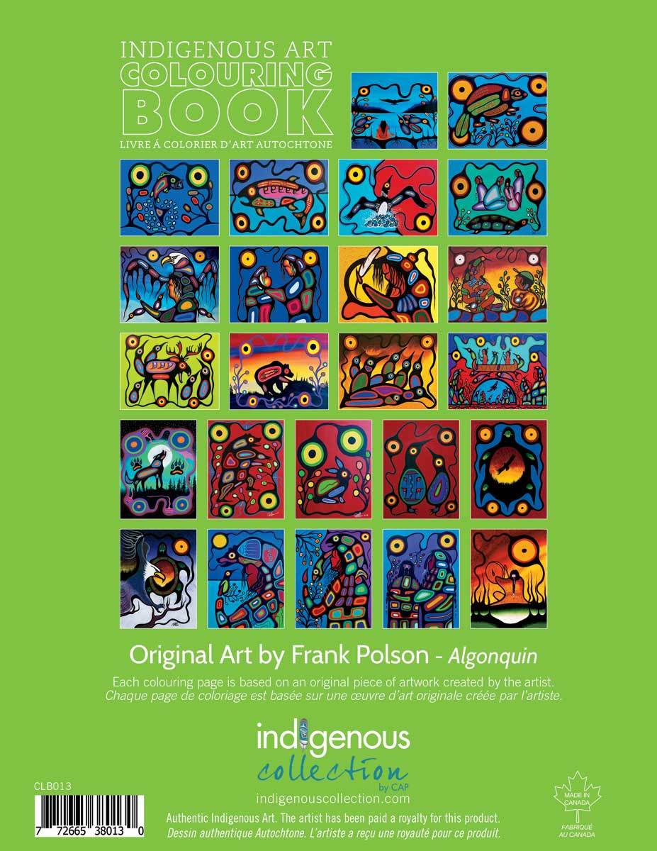 Indigenous art colouring book by artist Frank Polson. His cultural background is Algonquin. The dimensions of the colouring book are 8.5 x 11" and it features 28 colouring pages based on original pieces of artwork created by the artist. It also contains information on the artist's cultural background, the artist's biography and photos. The back cover highlights the original art for reference. The artist or copyright holder has been paid a royalty for the sale of this product. Made in Canada.