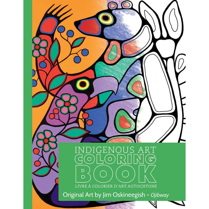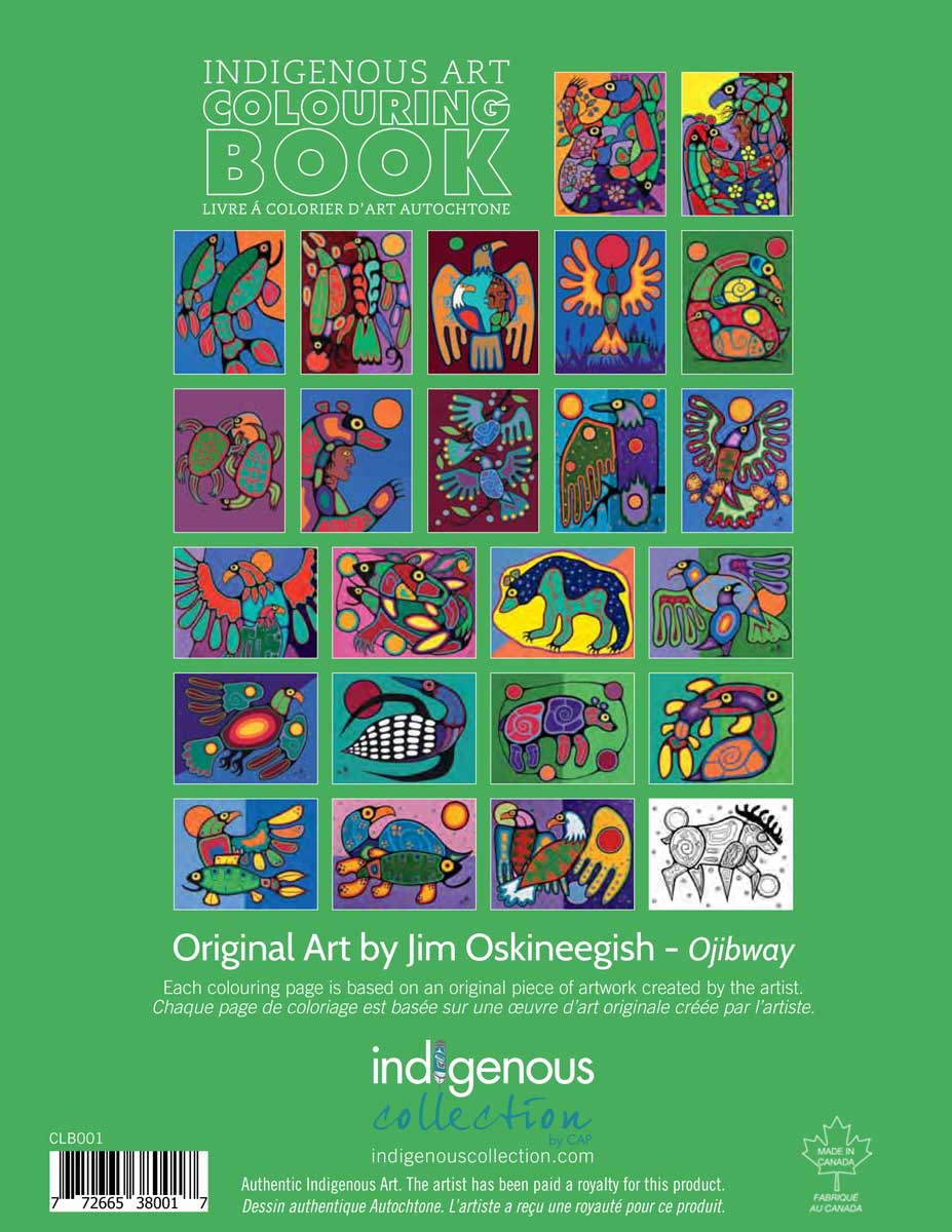 Indigenous art colouring book by artist Jim Oskineegish. His cultural background is Ojibway. The dimensions of the colouring book are 8.5 x 11" and it features 28 colouring pages based on original pieces of artwork created by the artist. It also contains information on the artist's cultural background, the artist's biography and photos. The back cover highlights the original art for reference. The artist or copyright holder has been paid a royalty for the sale of this product. Made in Canada.