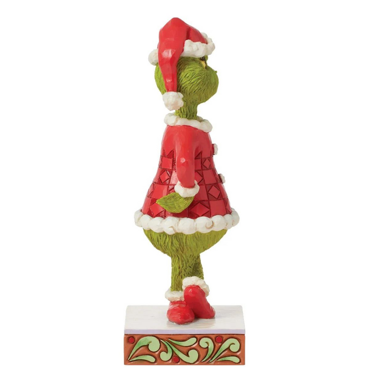 The Jim Shore figurine THE GRINCH with his hands on his hips is an adorable figurine that is perfect to add to your collection. This figurine has the grinch dressed as Santa Claus, and he is wearing a patchwork red suit on a rosemale stage. The grinch plans on stealing the Christmas spirit with his style and snark!