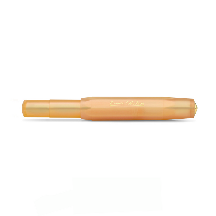 Introducing the Kaweco Collection Apricot Pearl Fountain Pen, a limited edition masterpiece following the triumph of the Iridescent Pearl. Unleashing creativity with refreshing hues and an enchanting iridescent effect, this German-crafted pen transforms from a subtle shade of orange to a shimmering green under different lights. With gold accents perfectly complementing the warm tones, the pen exudes a relaxed, positive aura, offering a stylish escape from daily stress. The meticulously designed packaging, mirroring the pen's visual allure, ensures the Kaweco Sport Collection Apricot Pearl is a captivating eye-catcher even when unopened.
