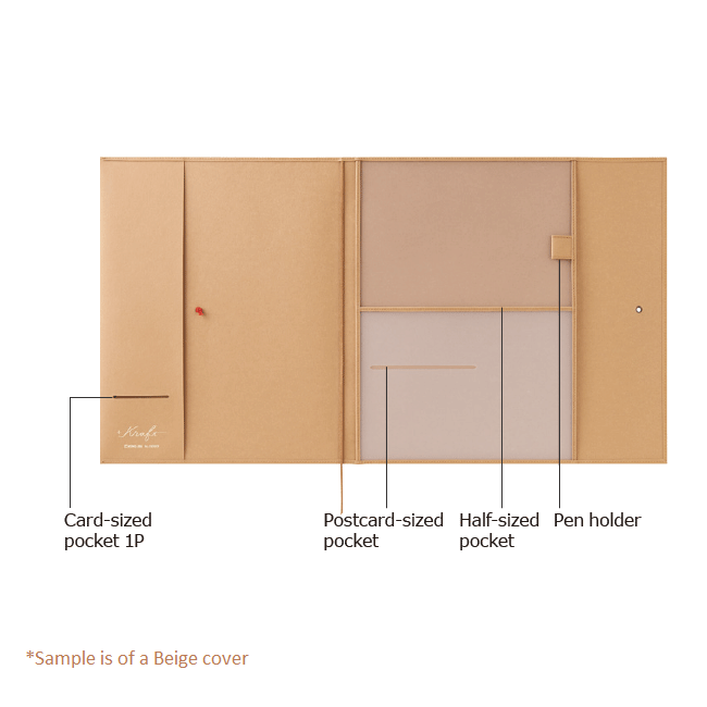 Also Features: 1 card-sized pocket, postcard-sized pocket, one half-sized pocket, and a pen holder