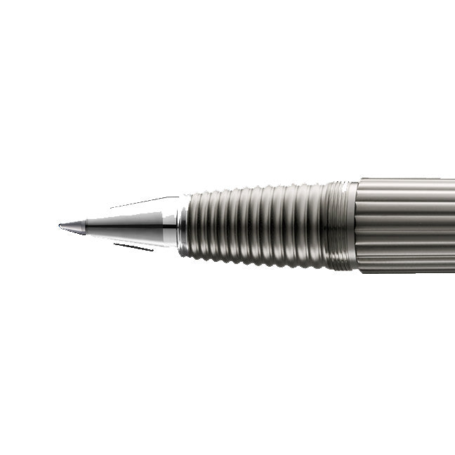 High-quality rollerball with a distinctive, engine-turned container - titanium, matt (PVD-refined). Contrasting, strictly cylindrical and screwed cap with a platinum polished clip (galvanized).
