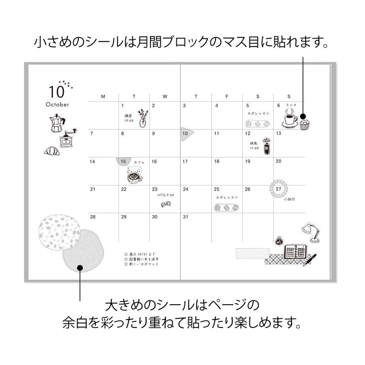A sticker made of masking tape for decorating notebooks and diaries, planners. The translucent sticker can be applied on top of each other to create even more fun designs. This sticker for planners combines larger stickers which are in increasing demand for planner decorations with smaller ones.
