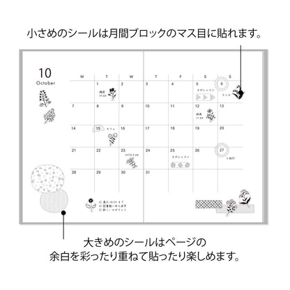 A sticker made of masking tape for decorating notebooks and diaries, planners. The translucent sticker can be applied on top of each other to create even more fun designs. This sticker for planners combines larger stickers which are in increasing demand for planner decorations with smaller ones.