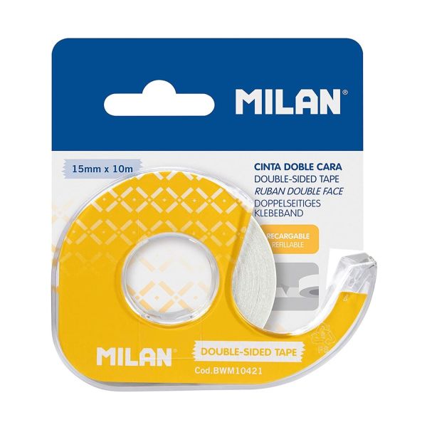 Double sided adhesive tape 15 mm x 10 m in a yellow refillable dispenser. With metal cutting blade. For precision joints. Application: place the tape on the piece to be adhered, lift the protection film with your finger and adhere to the desired surface. Used in crafts, stationery and domestic use.