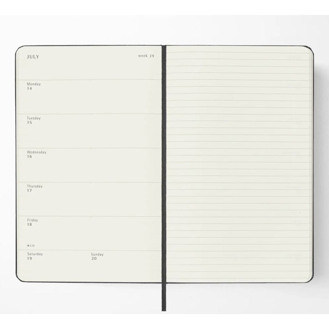 • Displays the days of the week on one side opposite a ruled page for tasks and notes