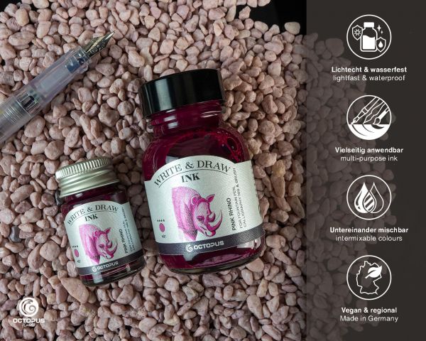In their large range of colors, which were developed for daily use in fountain pens and from Graphic designers, illustrators, calligraphers and artists also love to use a calligraphy pen, glass pen or brush for writing, sketching, drawing and coloring. Each one of the 38 brilliant shades impresses with its intense color power thanks to its high, balanced pigmentation. In addition to deep black and various shades of gray, the extensive color palette also includes a particularly opaque white, which can be used on dark surfaces. When developing the drawing ink, particular attention was paid to its use in fountain pens. The use of the finest color pigments in a carefully balanced recipe ensures high light fastness and a good, even ink flow without clogging the fountain pen's ink pipe. The excellent writing behavior of the classic Octopus fountain pen inks can also be found in these pigmented writing inks. The Write & Draw drawing ink meets the requirements for document-safe ink according to DIN ISO 12757-2 and DIN ISO 14145-2 and is made exclusively with vegan ingredients. Writing enthusiasts love the razor-sharp typeface that can be achieved on paper suitable for fountain pens and the pleasant shading of the Write & Draw writing ink. The calligrapher creates the finest hairlines and impressive flourishing elements and the urban sketcher creates precise outlines. The ink or ink dries waterproof in a very short time and can then be painted over with a different color of the Octopus Write & Draw inks or watercolors. It is eraser-proof and most of the colors are also highlighter-resistant. The Octopus Write & Draw ink is ideal for coloring, both pure and diluted with water. When used undiluted, the waterproof ink impresses with its opacity. The many colors of Octopus drawing ink can be mixed with each other or with water. In this way, countless shades of color can be achieved for beautiful watercolor effects.