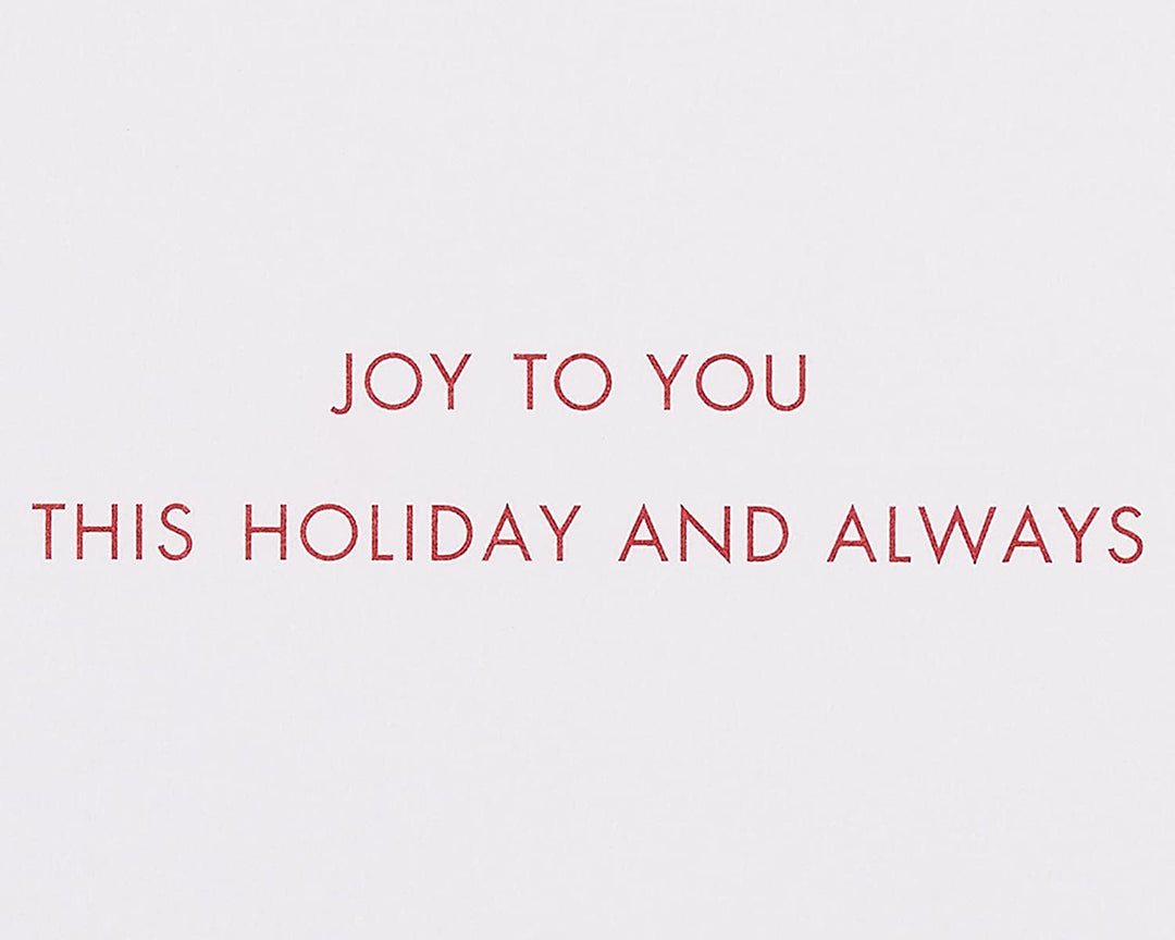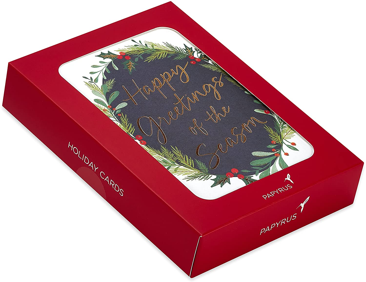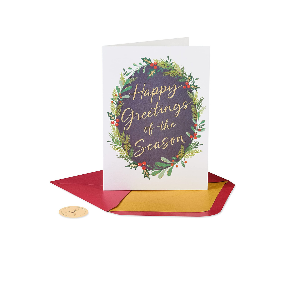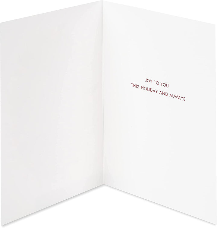 This set of 14 cards comes complete with 14 lined envelopes and 16 gold seals to send to family members, friends, coworkers, neighbors, clients, teachers – anyone who’s in your heart this winter. Each card features a chalkboard-inspired lettering design surrounded by an oval wreath of winter foliage with metallic foil embellishment. The message is open to people of any faith and offers a simple wish for today and always. A card from Papyrus is a beautiful way to celebrate the season.