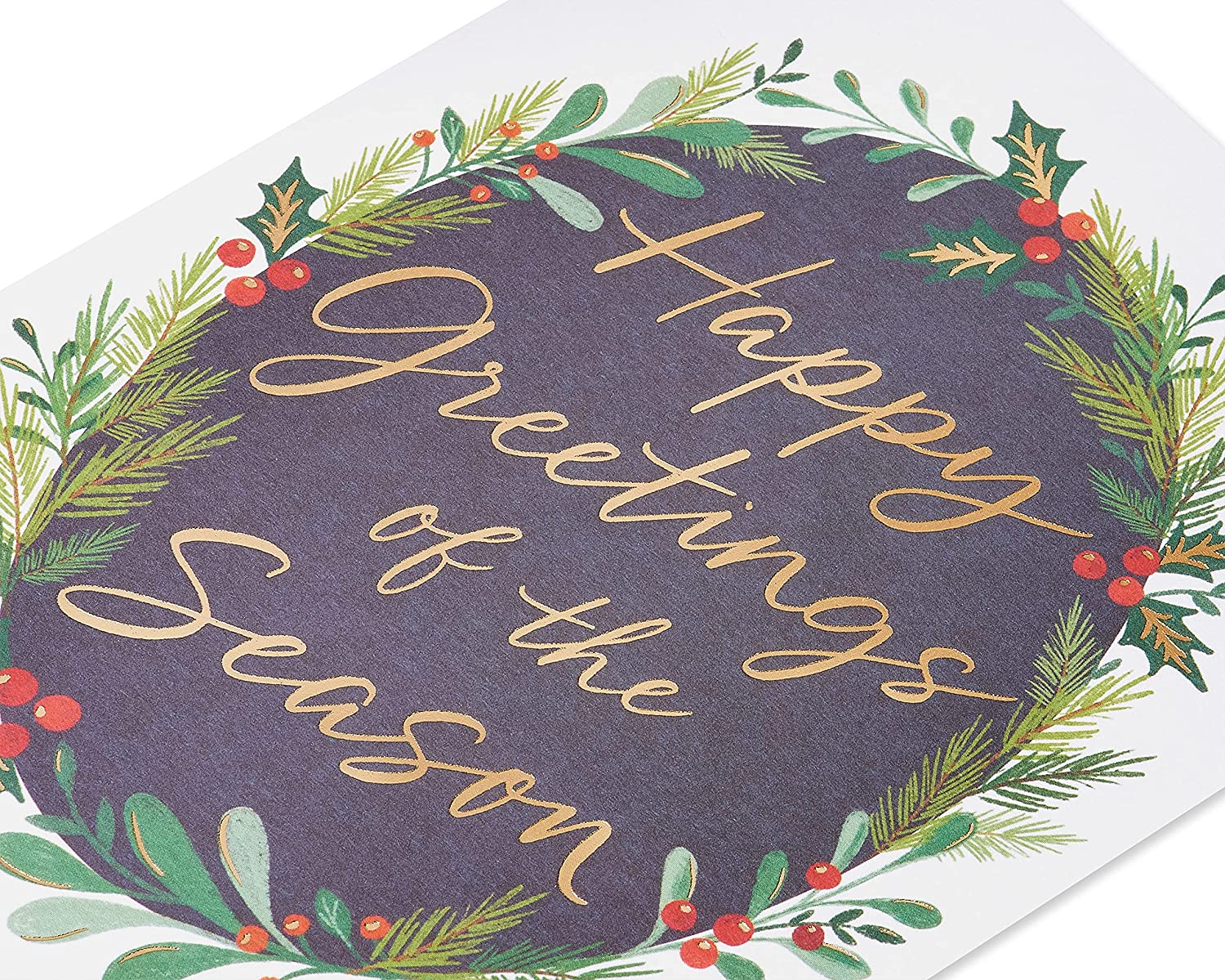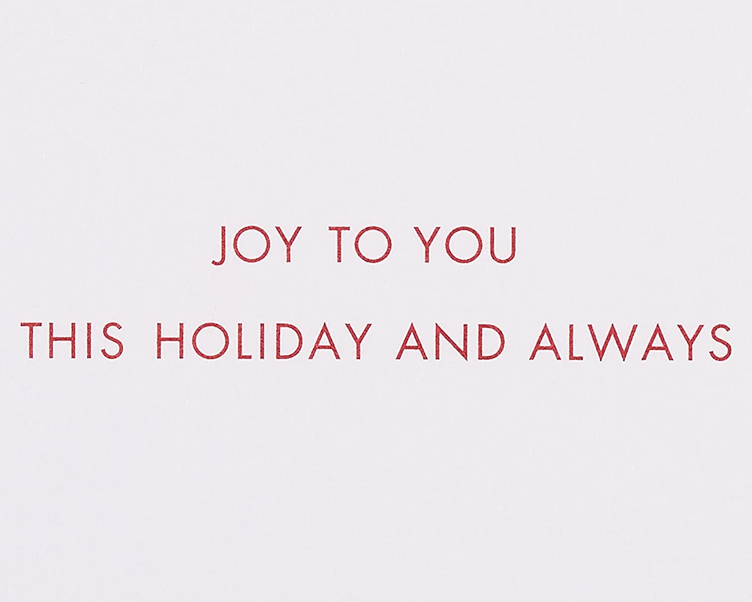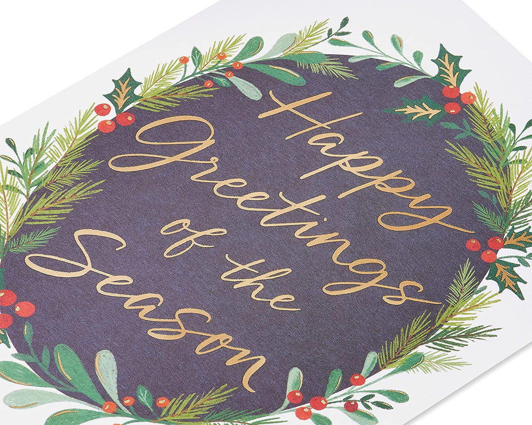 This set of 14 cards comes complete with 14 lined envelopes and 16 gold seals to send to family members, friends, coworkers, neighbors, clients, teachers – anyone who’s in your heart this winter. Each card features a chalkboard-inspired lettering design surrounded by an oval wreath of winter foliage with metallic foil embellishment. The message is open to people of any faith and offers a simple wish for today and always. A card from Papyrus is a beautiful way to celebrate the season.