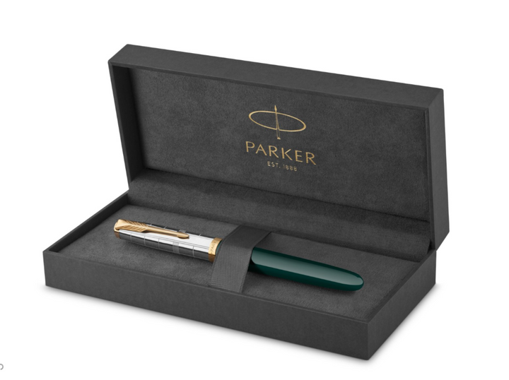 The Parker 51 Premium is a reimagining of the iconic classic first introduced in 1941. The original took the world by storm and this modern take is equally as stunning, whilst retaining its signature streamlined silhouette and unique hooded nib for a smooth reliable writing experience. The barrel crafted from precious resin has a glossy finish in four colours - Black, Forest Green, Rage Red and Turquoise. Each colour carefully selected from the heritage range to appeal to modern tastes. Gold trims bear the unmistakeable hallmark of superior PARKER craftsmanship with the cap displaying one of four beautifully engraved patterns taking their inspiration from the designs and structures of contemporary architecture. The Parker 51 Premium is a classic icon truly reimagined for today.